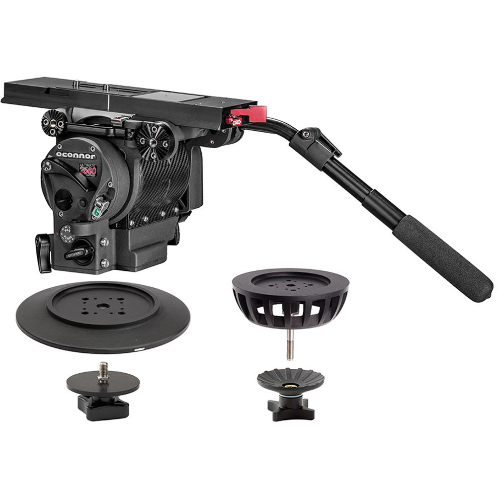 The Ultimate 2560 Fluid Head Package from OConnor is designed for use with the current crop of digital cinema cameras. Weighing less than 18 pounds, 2560 is capable of supporting camera payloads up to 66 pounds at a 6" center of gravity above the platform, making it well suited for cameras such as the ARRI Alexa in a portable configuration or any lightweight digital cinema camera in a full studio configuration. The head comes packaged with both a Mitchell base and a 150mm ball base adapters with tie-downs for expanded tripod compatibility. It also comes with a large Euro-style quick release for rapid mounting and dismounting of large camera rigs, a pan handle, and a pan handle extension.