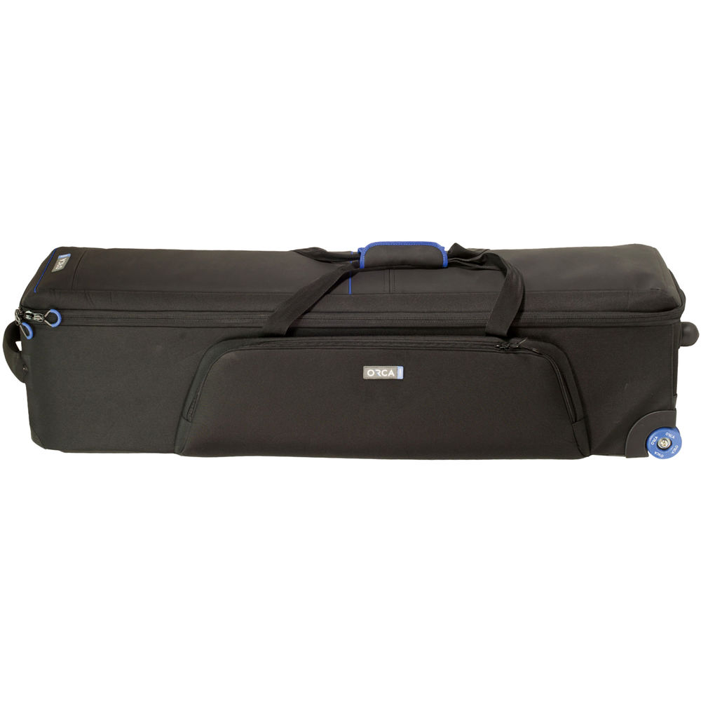 The large Video Camera Tripod Bag from Orca is designed to carry ENG and EFP heavy-duty tripods. The bag is protected from all sides with Orca Bag's honeycomb frame and plastic injection bottom protection. The bag has strong skate wheels, carrying handles, a large external pocket for accessories, and two external buckles to attach a shoulder carrying strap (sold separately).