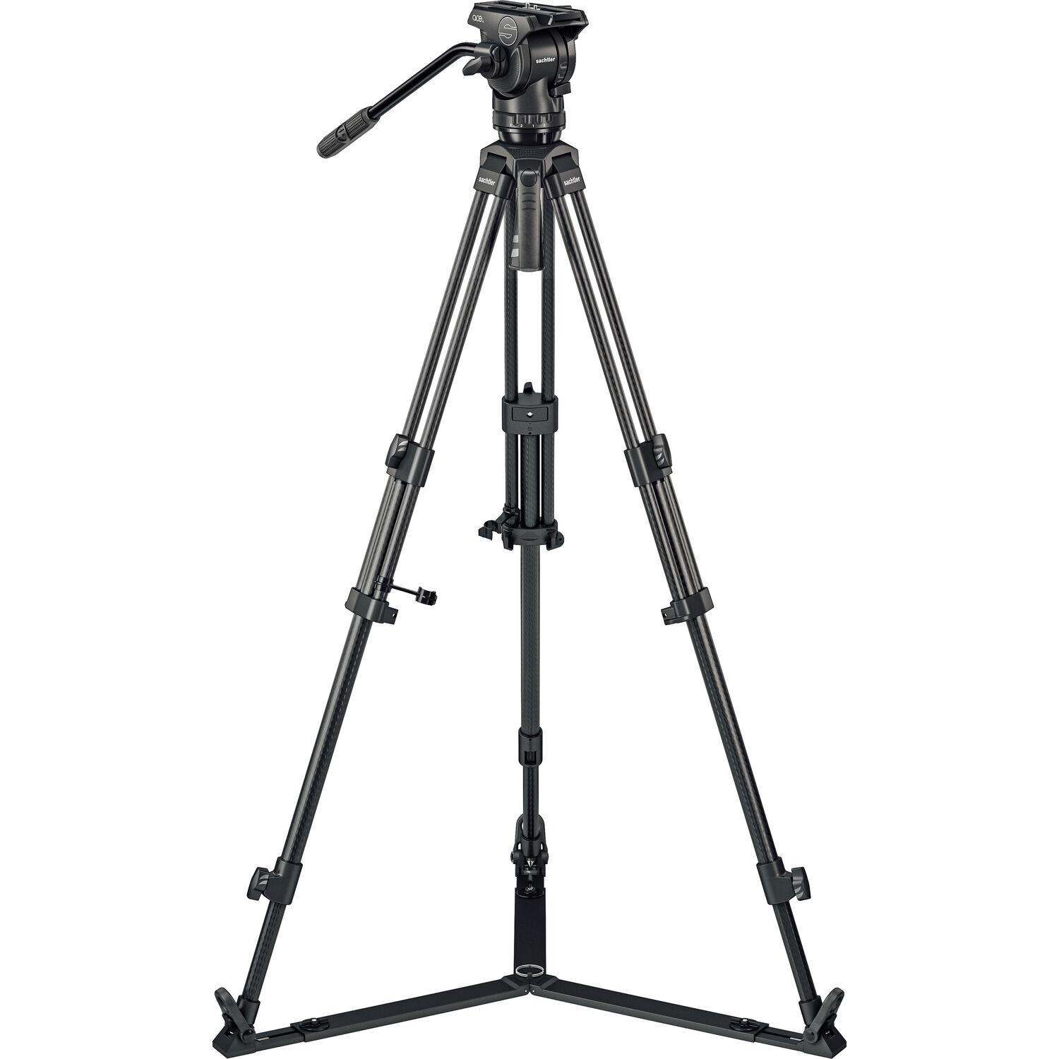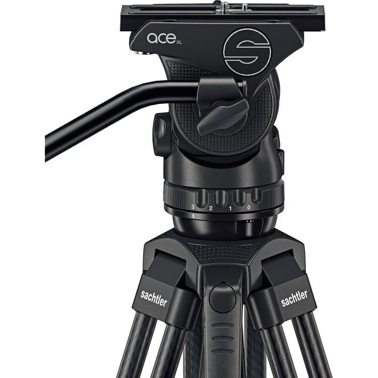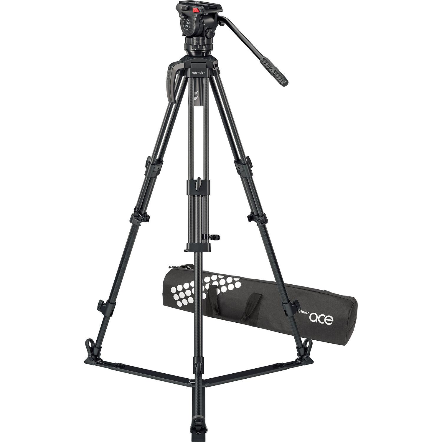 The 75/2 Mark II Carbon Fiber Tripod System with Ace XL Head & Ground Spreader from Sachtler pairs the Ace XL fluid head and the carbon fiber 75/2 tripod legs with a ground spreader. This kit offers a 17.6 lb load capacity for midsized camera rigs, as well as a balancing camera plate, 9-step + 0 counterbalance, and 3-step + 0 pan/tilt drag. Carry the system with the included handle and bag for easy transport to the set.
