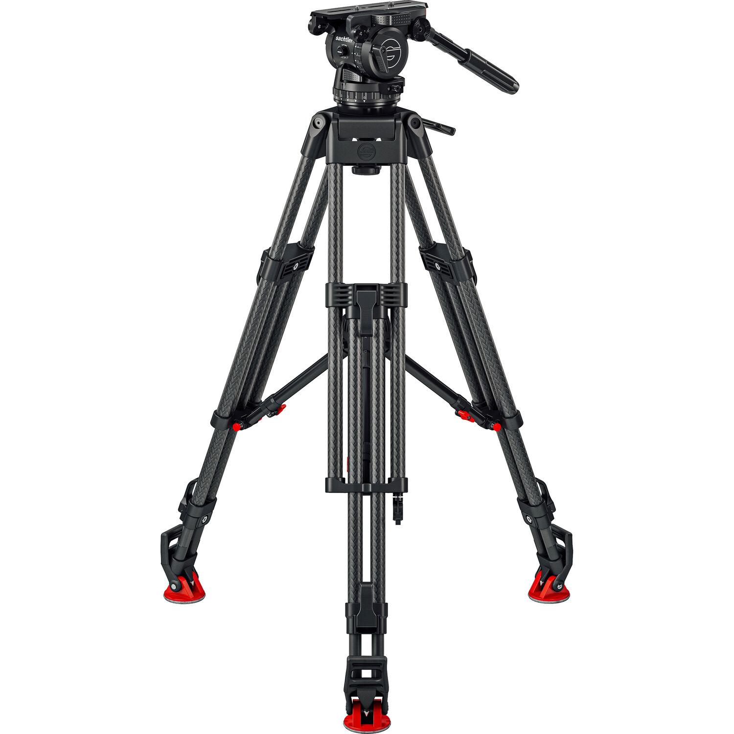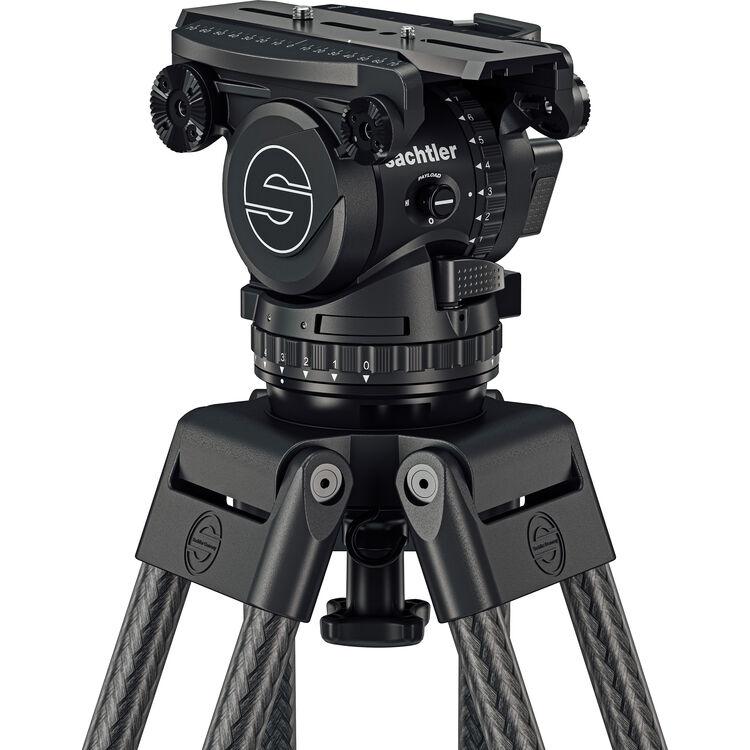 The CF 100 ENG HD 2CF Mid-Level Tripod System with Cine 20 Fluid Head from Sachtler pairs the Cine 20 fluid head and the carbon fiber CF 100 ENG HD 2CF tripod legs with a mid-level spreader. This kit offers a fluid head 48 lb payload for midsized camera rigs, as well as a sideload camera plate, 16 steps of counterbalance, and seven steps of pan/tilt drag. Carry the system with the included handle and bag for easy transport to the set.