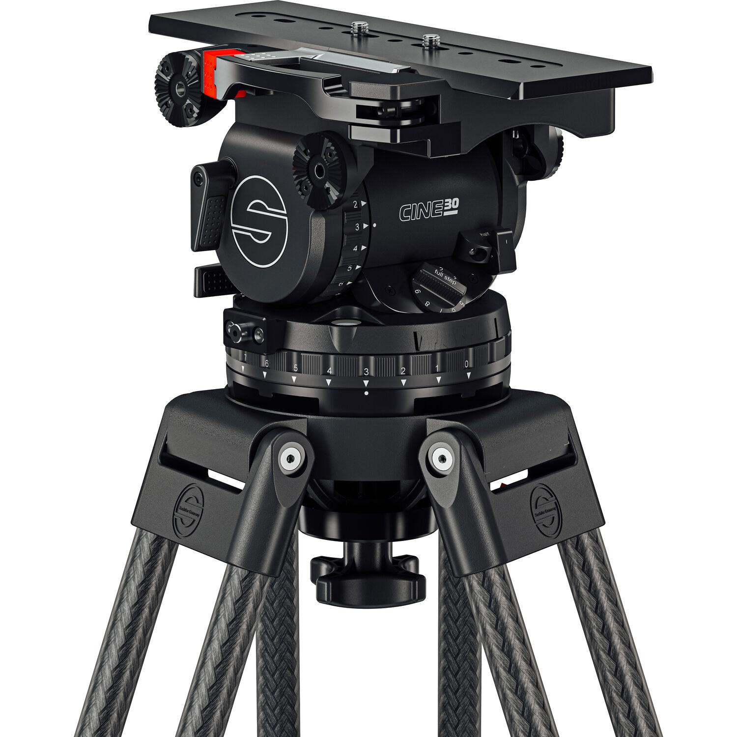 The CF 150 EFP 2 Ground-Level Tripod System with Cine 30 Fluid Head from Sachtler pairs the Cine 30 fluid head and the carbon fiber CF 150 EFP 2 tripod legs with a ground spreader. This kit offers a fluid head with a 71 lb payload for heavy-duty camera rigs, as well as a sideload camera plate, 18 steps of counterbalance, and seven steps of pan/tilt drag.