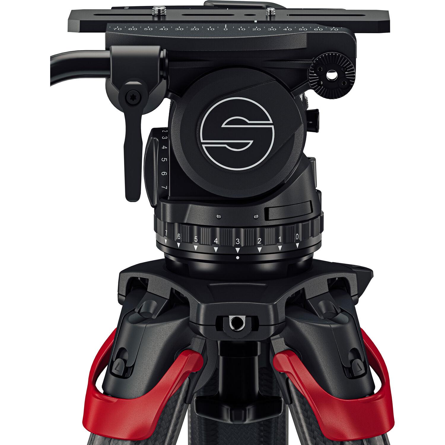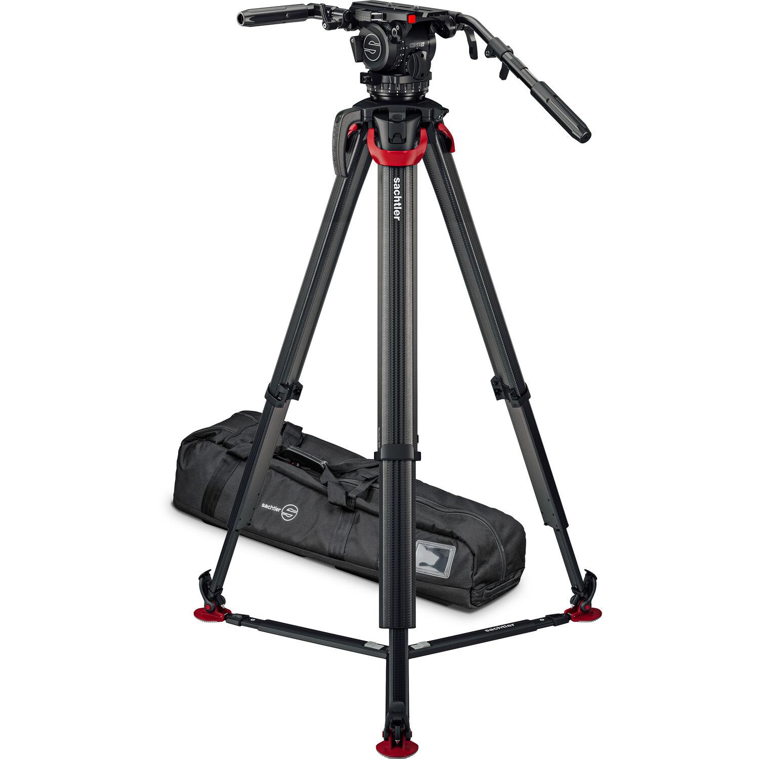 The flowtech 100 GS Carbon Fiber Tripod System with Cine 20 Fluid Head from Sachtler pairs the Cine 20 fluid head and the carbon fiber flowtech 100 tripod legs with ground-level spreader. This kit offers a 66 lb load capacity for midsized camera rigs, as well as a sideload camera plate, 16 steps of counterbalance, and seven steps of pan/tilt drag. Carry the system with the included handle and bag for easy transport to set.