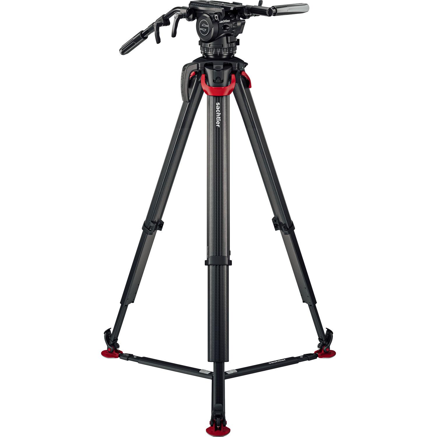 The Sachtler flowtech Carbon Fiber Tripod with Ground Spreader eschews the common single or double carbon fiber tube design and has redesigned the shape of the legs for improved torsional strength. The legs weigh 8.8 lb, yet they can support a payload of up to 66 lb and extend from a minimum height of 16.9" to a maximum height of 62.6" when using the included removable ground spreader. Each leg features a single clamping lever that locks and unlocks the sections.