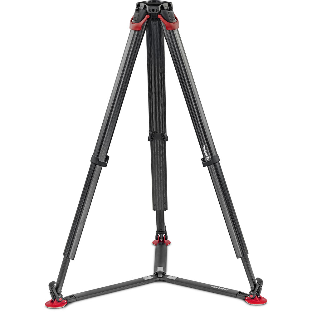 The Sachtler flowtech 75 GS Carbon Fiber Tripod with Ground Spreader eschews the common single or double carbon fiber tube design and instead has redesigned the shape of the legs for improved torsional strength. The legs weigh just under 7 pounds yet they can support a payload of up to 44 pounds and extend from a minimum height of 10" to a maximum height of 62.2" when using the included ground spreader. Each leg features a single clamping lever that locks and unlocks the sections.