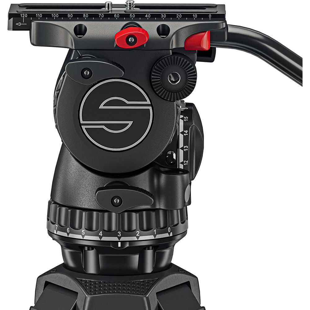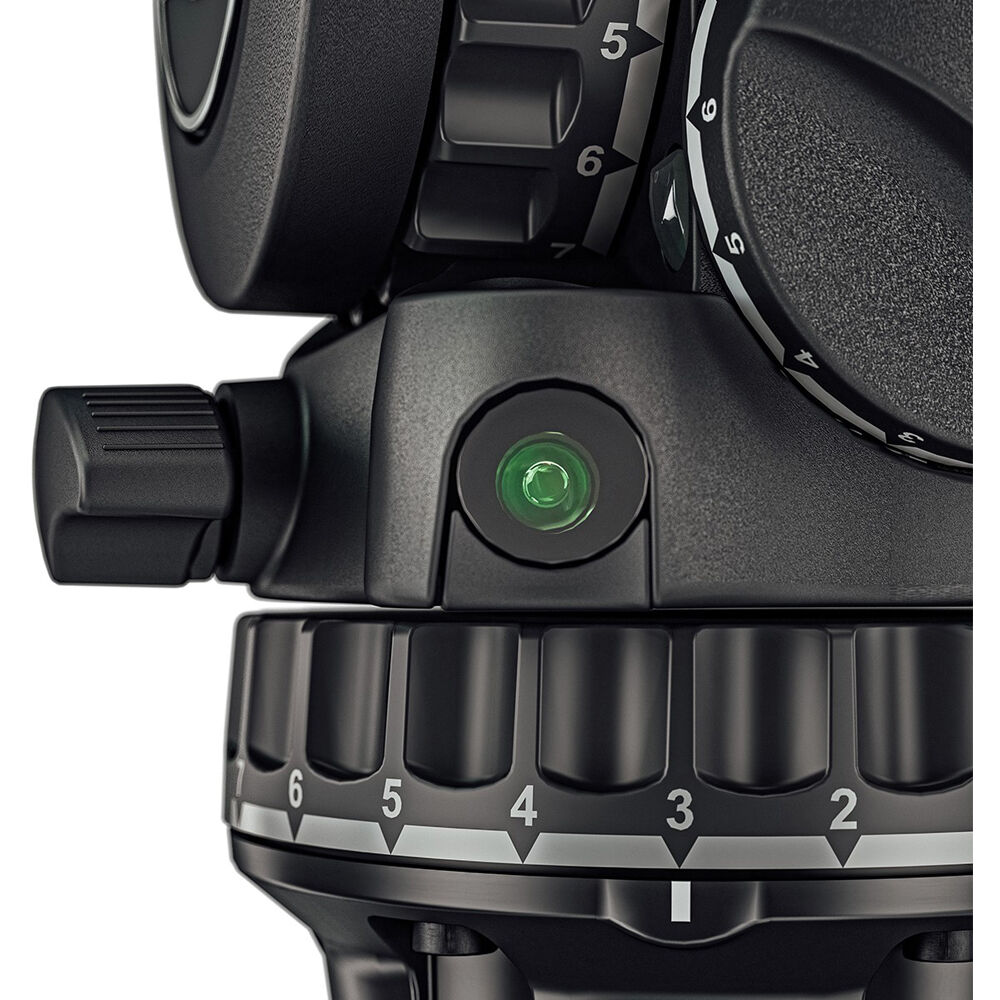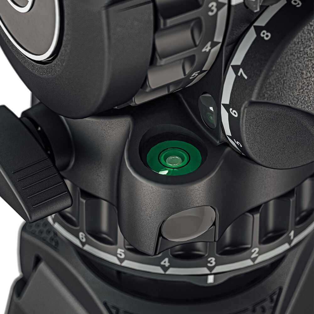 The head allows you to tilt forward so you can tilt straight down and tilt almost straight up as well. Pan and tilt have seven independent drag settings, plus a zero setting for no drag at all. Borrowing from the aktiv system, the bubble level has been improved, not only is it illuminated, but now you can see the bubble level from the side, as well as when looking down on the head, for intuitive leveling from almost any position.