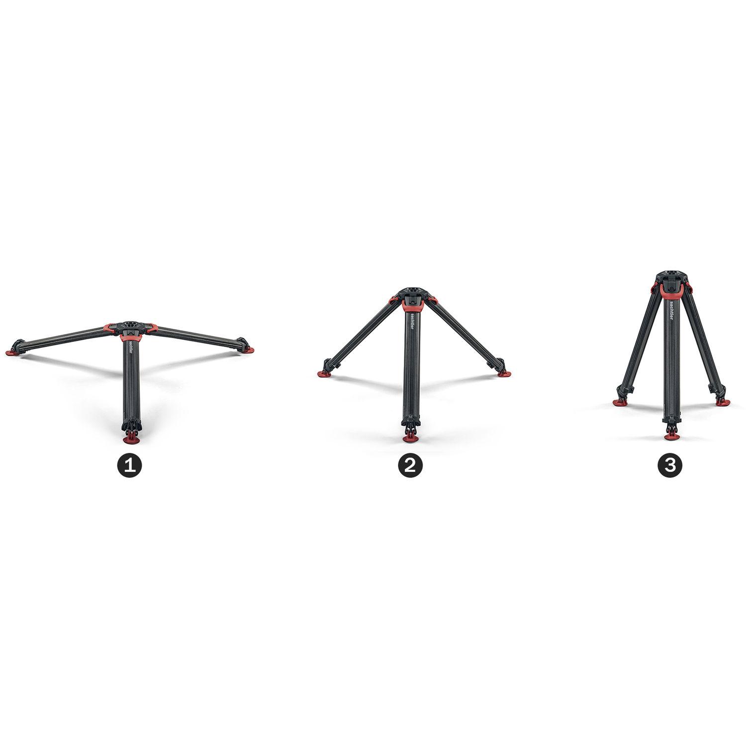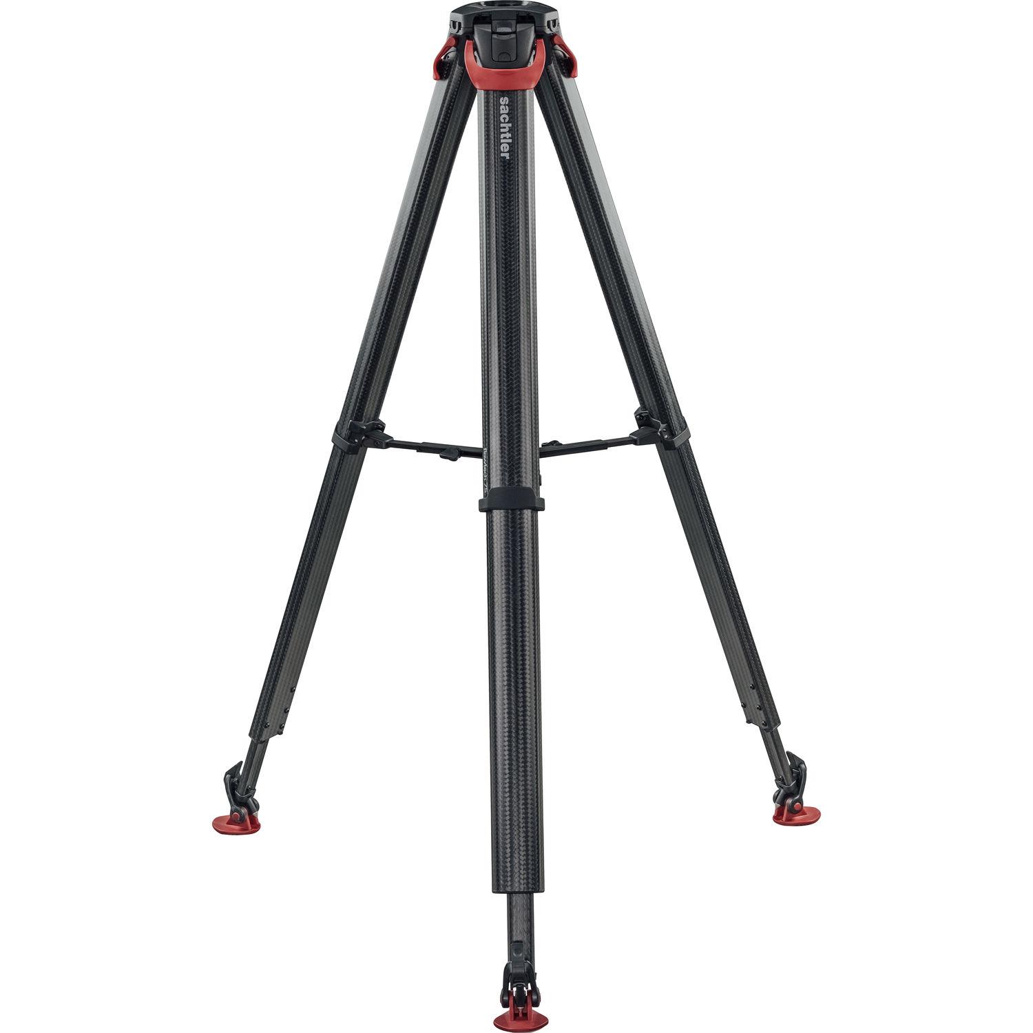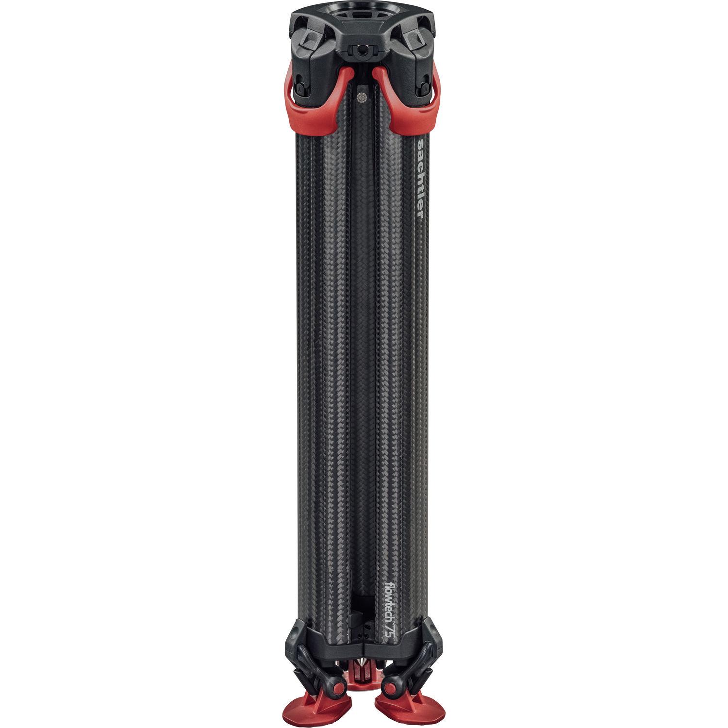 The Sachtler Flowtech 75 MS Carbon Fiber Tripod with Mid-Level Spreader and Rubber Feet eschews the common single or double carbon fiber tube design and instead has redesigned the shape of the legs for improved torsional strength. The legs work weigh just under 7 pounds yet they can support a payload of up to 44 pounds, and extend from a minimum height of 24" to a maximum height of 61" when using the included removable mid-level spreader. Each leg features a single clamping lever that locks and unlocks the sections.