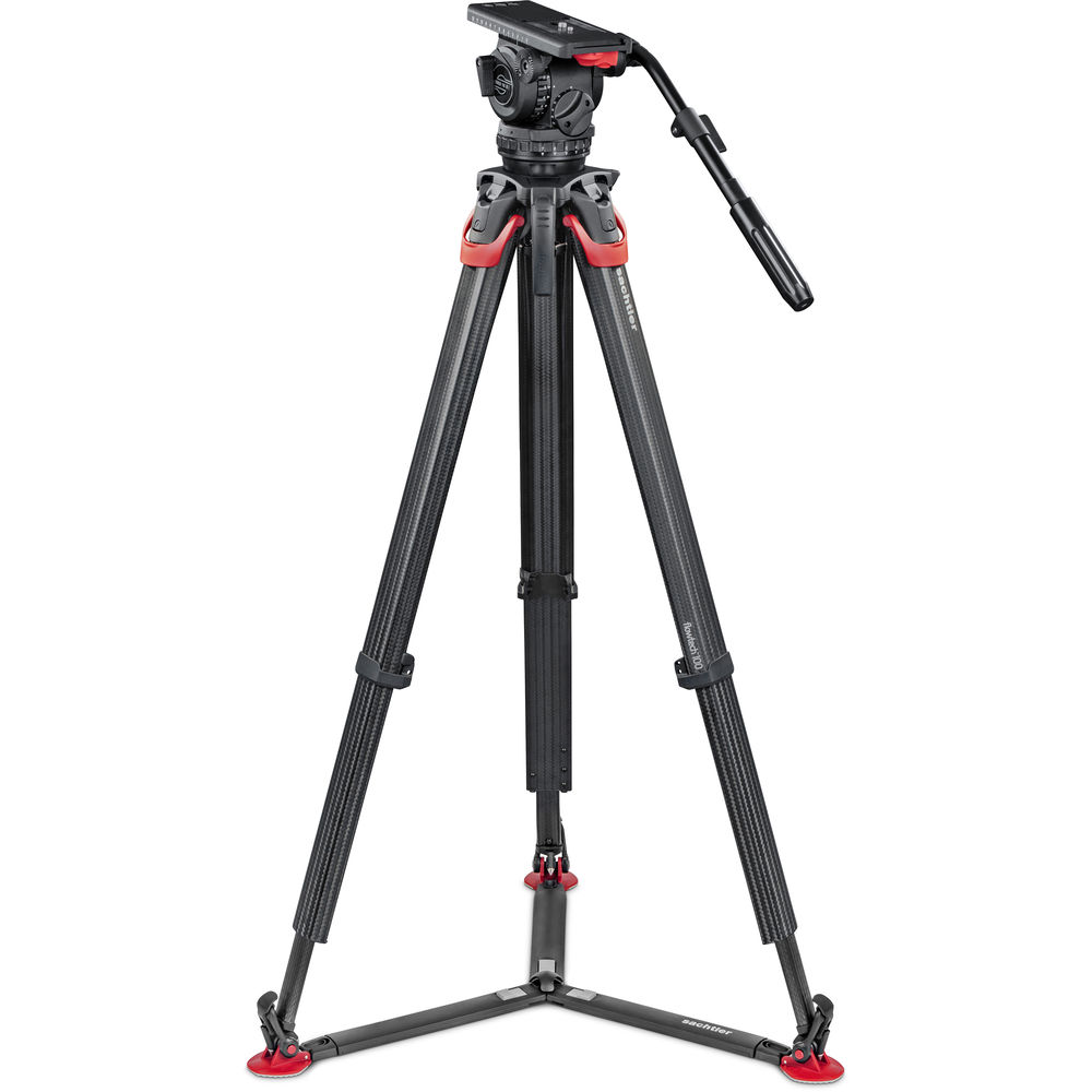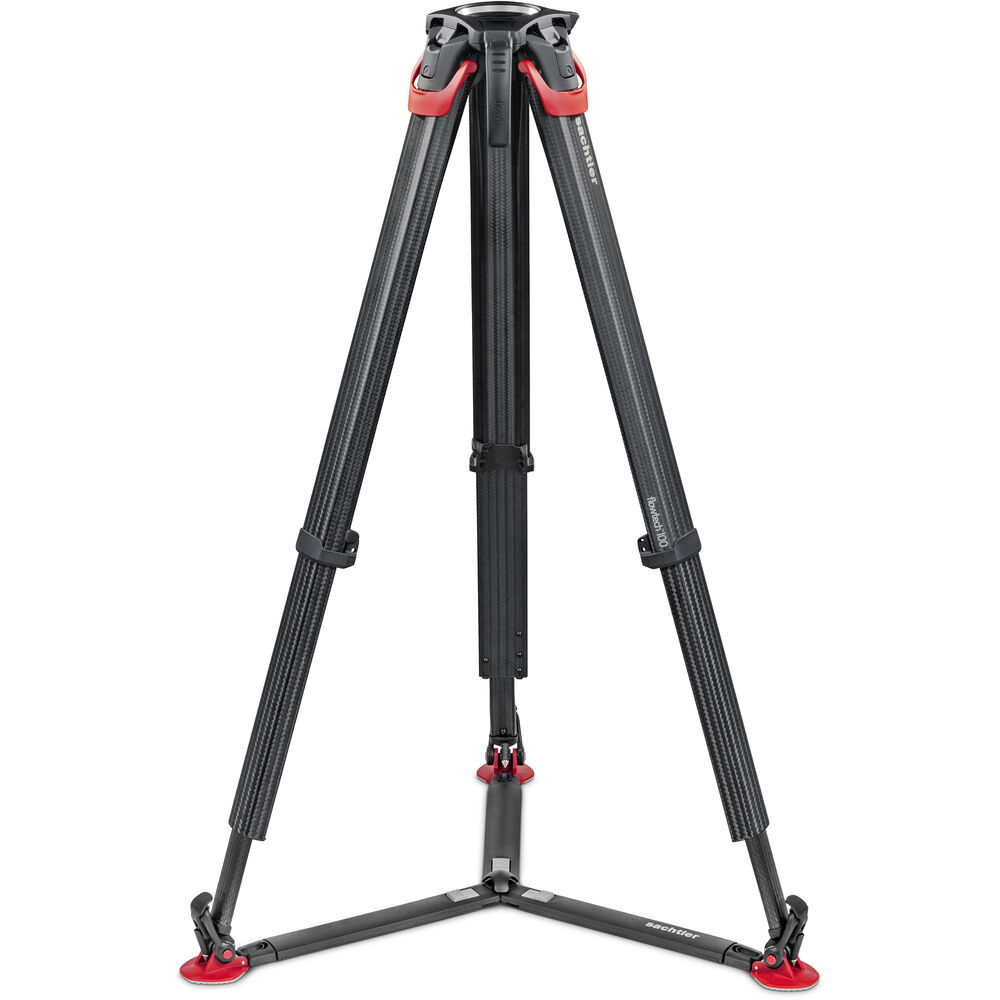 The Sachtler flowtech 100 Carbon Fiber Tripod with Ground Spreader eschews the common single or double carbon fiber tube design; instead it has redesigned the shape of the legs for improved torsional strength. The legs weigh 8.8 pounds, yet they can support a payload of up to 66 pounds, and extend from a minimum height of 16.9" to a maximum height of 62.6" when using the included removable ground spreader. Each leg features a single clamping lever that locks and unlocks the sections.
