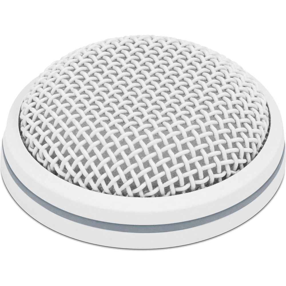 The white MEB 102-L Omnidirectional Boundary Microphone from Sennheiser is for capturing audio in permanent installations such as conference rooms, boardrooms, lecture halls, school auditoriums and more. It features a bi-color LED for status indication and a programmable button for On, On/Off, PTT, and PTM modes. It features an omnidirectional polar pattern and has a frequency response of 40 Hz to 20 kHz.