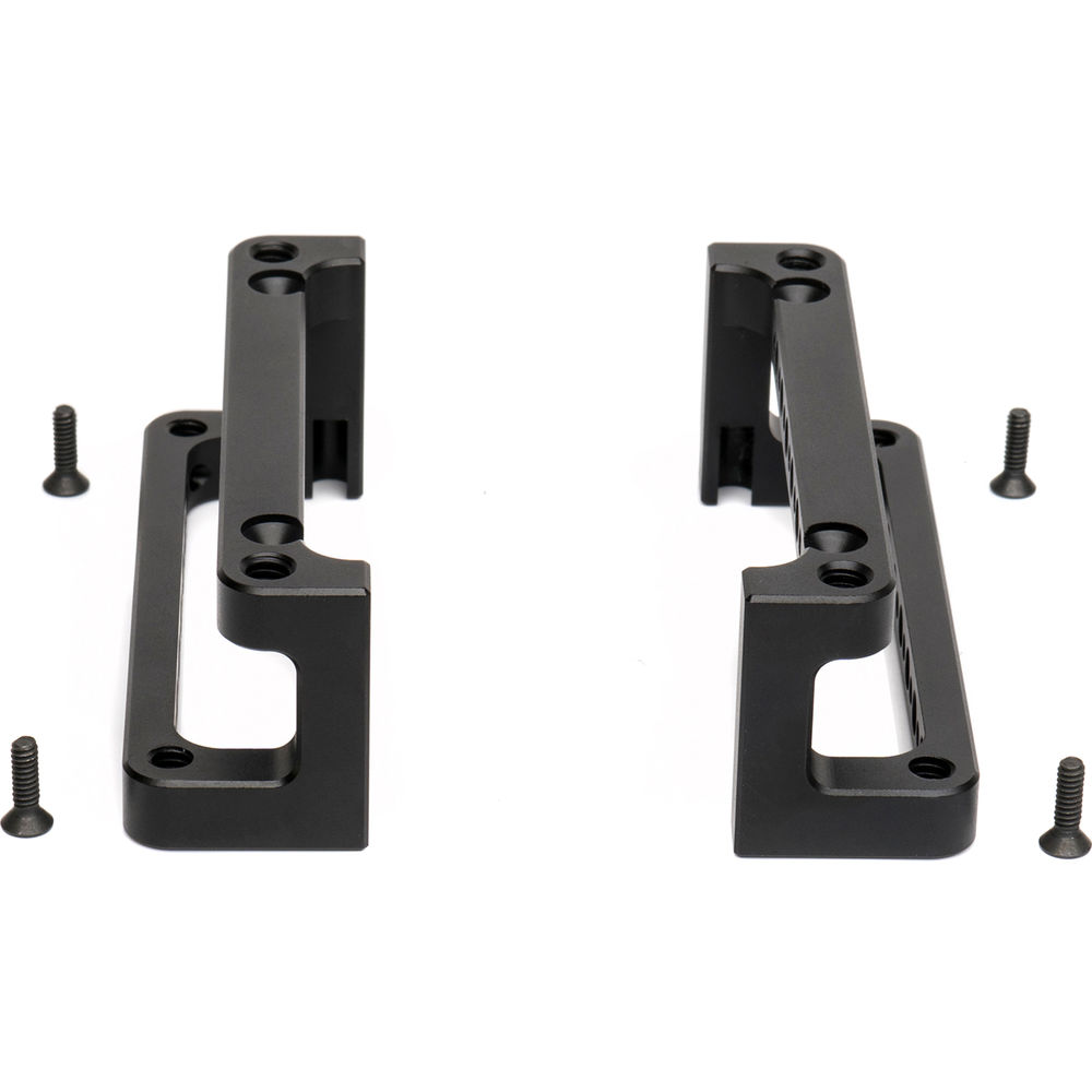 The SmallHD Mounting Cage for 503 UltraBright Monitor includes two metal brackets that attach to the monitor and provide mounting points for accessories. The brackets mount on the left and right sides of the monitor and provide 1/4"-20 and 3/8"-16 threads for accessories. They also feature slots for attaching the optional dedicated sun hood for this monitor, which secures by magnetic mini-rods into these slots. Four screws are included for attaching the cage to the monitor.