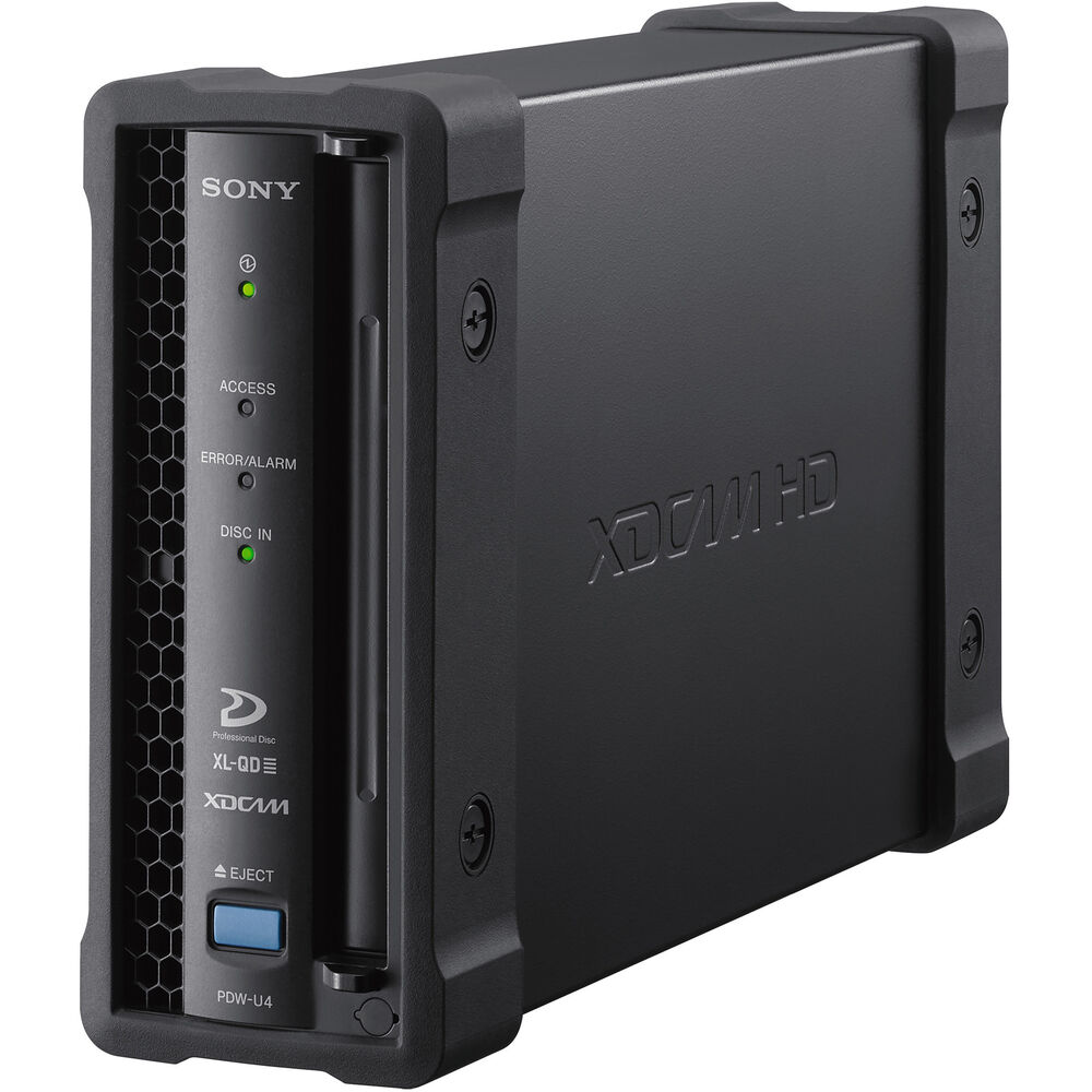 The Sony PDW-U4 XDCAM Professional Disc Drive is an external drive for XDCAM Professional Discs, whether recording in SD or HD. The drive supports single-, dual-, triple-, and quad-layer disc media. In addition to using 128GB write-once disc media, the drive also supports legacy 23, 50, and 100GB rewritable media.
