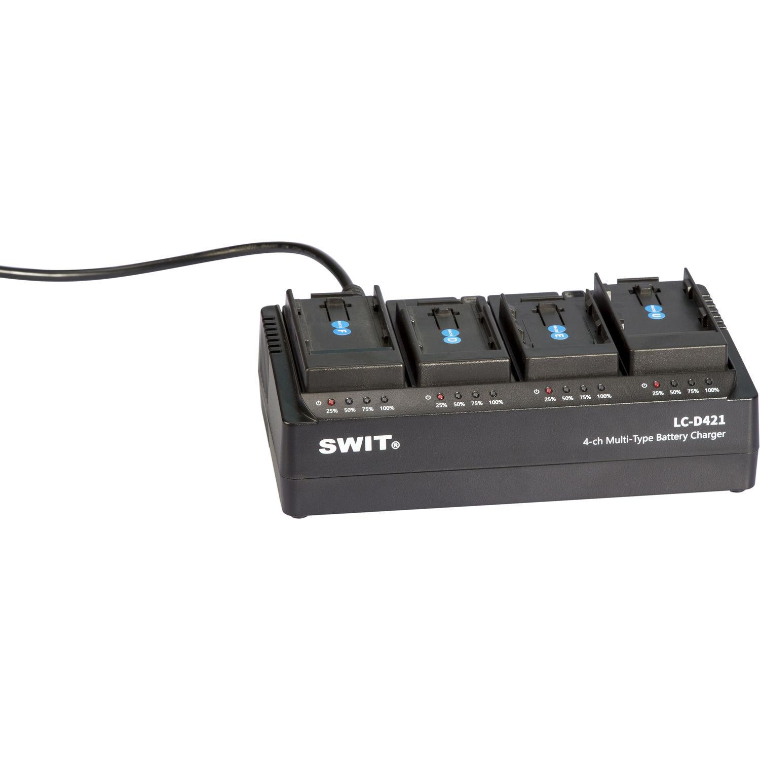 Use the 4-Channel Simultaneous DV Battery Charger from SWIT to charge up to four batteries simultaneously. It is equipped with four battery plates compatible with Sony BP-U series and SWIT S-8U63, S-8U65, S-8U93, and S-8U95 batteries. You can also exchange the plates for different types of separately available battery plates. Each bay replenishes a battery at 2A, and an LED power indicator displays the charging status of each bay.