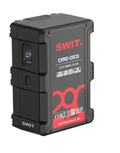 The SWIT CIMO-290S is a 290Wh Cine V-mount battery featuring high-power outputs, USB-C PD charging, and OLED power info display, designed for professional cinematographers who need reliable, long-lasting power on set.