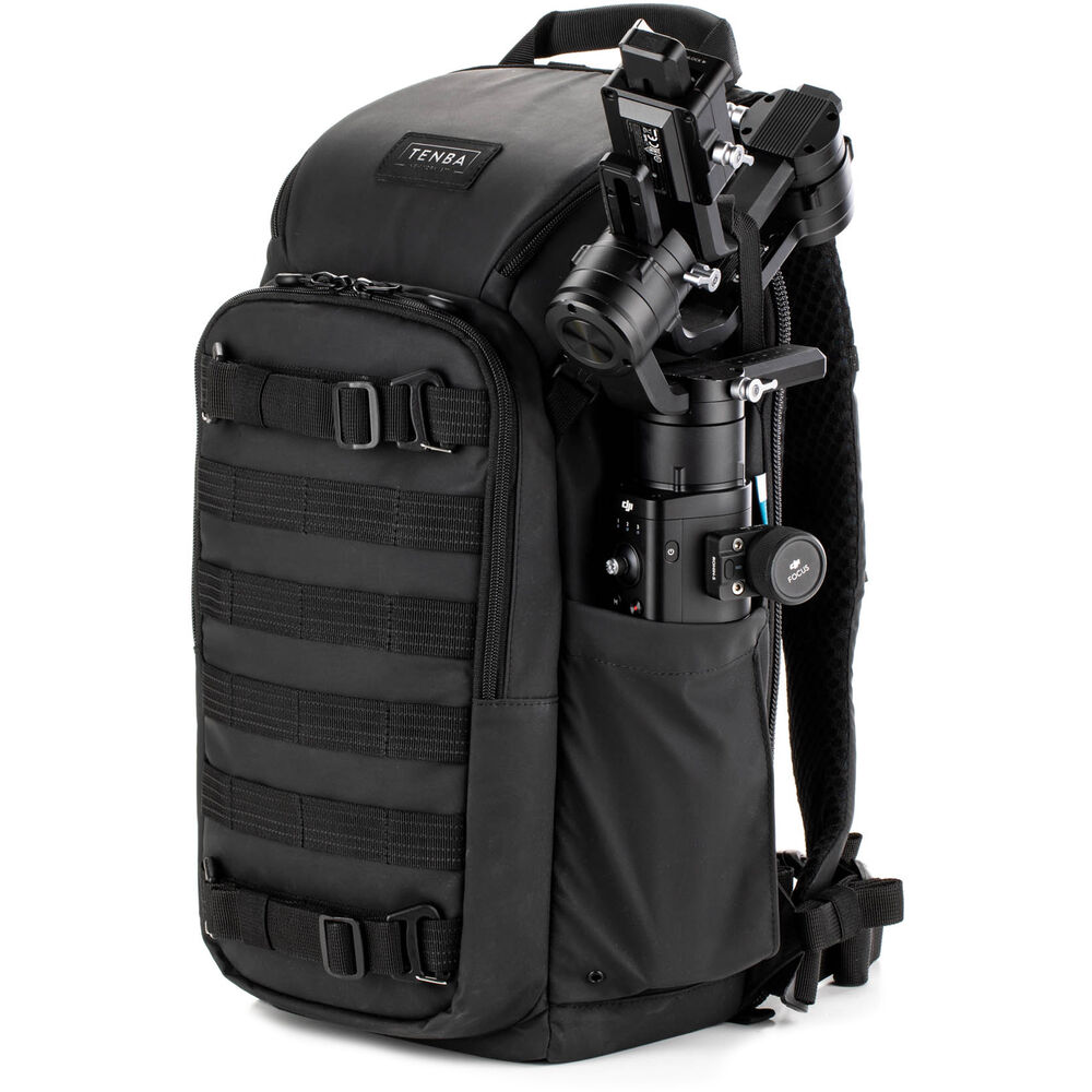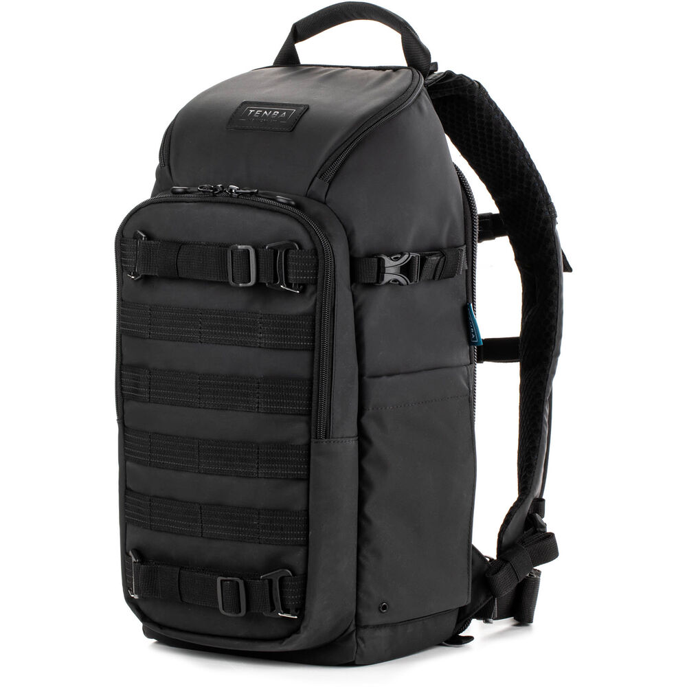 The updated black, 16L Axis V2 Backpack from Tenba is built for the working professional, content creator, photographer, or filmmaker. The pack holds two mirrorless or DSLR cameras, six 2.8mm zoom lenses, an 11" tablet, and a compact drone. This backpack is the first to include a hidden neoprene pocket that holds an Apple AirTag or Tile Bluetooth Tracker. The MOLLE webbing all around the exterior of the pack allows you to add additional Tenba accessories, including lens capsules, battery pouches, and card wallets. Tenba's exclusive Airflow harness and auto-adjusting Pivot-Fit straps mean the pack will fit, no matter what shape or size you are. The bag has unique dual sternum straps to ensure superior load-balancing across the chest, and allowing female users to position the straps above or below the bust for superior comfort. One of the sternum straps can be removed, if desired. A reversible rain cover is included, one side is black and the other silver to reflect UV rays.
