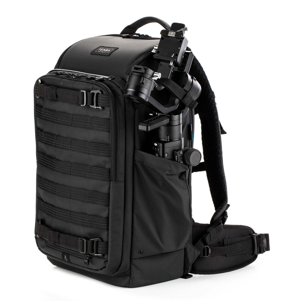 Tripods and gimbals can be attached to the front of the pack using the included security straps, or stored in the reinforced side pocket.