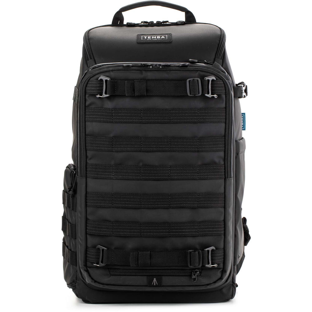 The updated black, 24L Axis V2 Backpack from Tenba is built for the working professional, content creator, photographer, or filmmaker. The pack holds two mirrorless or DSLR cameras, eight 2.8mm lenses, a 16" laptop, and a compact drone. This backpack is the first to include a hidden neoprene pocket that holds an Apple AirTag or Tile Bluetooth Tracker. The MOLLE webbing all around the exterior of the pack allows you to add additional Tenba accessories, including lens capsules, battery pouches, and card wallets. Tenba's exclusive Airflow harness and auto-adjusting Pivot-Fit straps mean the pack will fit, no matter what shape or size you are. The bag has unique dual sternum straps to ensure superior load-balancing across the chest, and allowing female users to position the straps above or below the bust for superior comfort. One of the sternum straps can be removed, if desired. A reversible rain cover is included, one side is black and the other silver to reflect UV rays.
