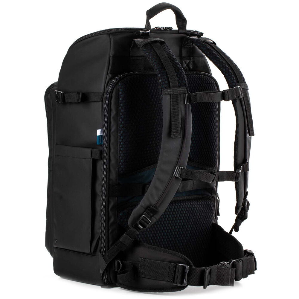 The updated black, 32L Axis V2 Backpack from Tenba is built for the working professional, content creator, photographer, or filmmaker. The pack holds two mirrorless, DSLR, or Cine cameras, nine 2.8mm lenses, a 17" laptop, and a compact drone. This backpack is the first to include a hidden neoprene pocket that holds an Apple AirTag or Tile Bluetooth Tracker. The MOLLE webbing all around the exterior of the pack allows you to add additional Tenba accessories, including lens capsules, battery pouches, and card wallets. Tenba's exclusive Airflow harness and auto-adjusting Pivot-Fit straps mean the pack will fit, no matter what shape or size you are. The bag has unique dual sternum straps to ensure superior load-balancing across the chest, and allowing female users to position the straps above or below the bust for superior comfort. One of the sternum straps can be removed, if desired. A reversible rain cover is included, one side is black and the other silver to reflect UV rays.