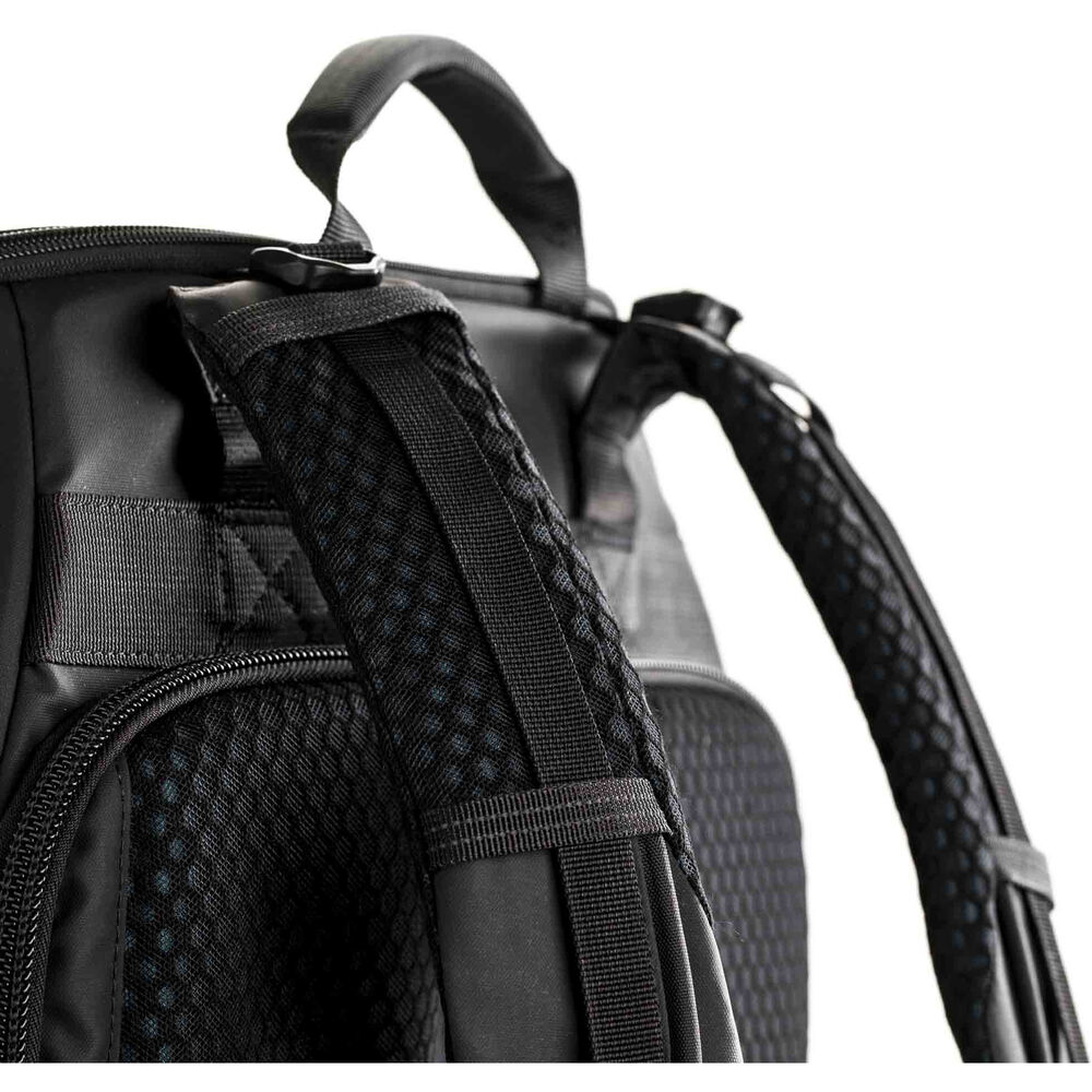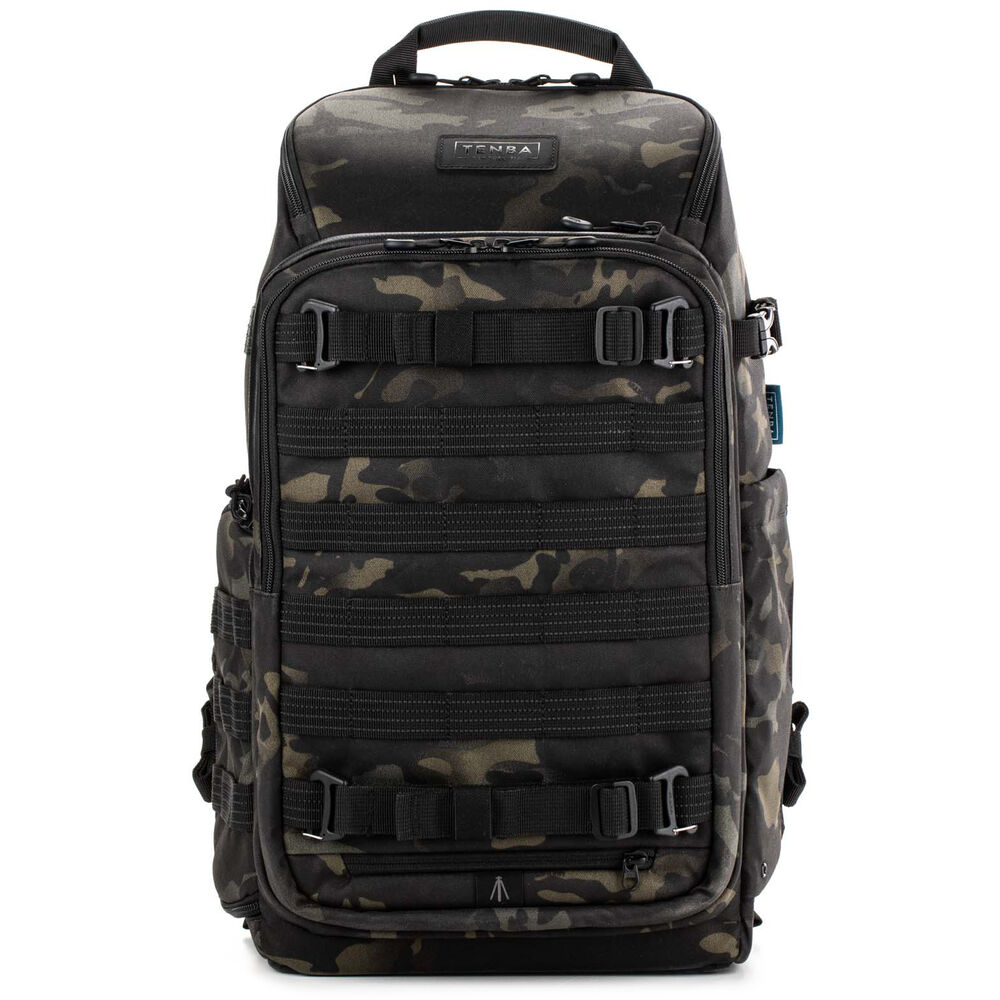 The updated multicam black, 20L Axis V2 Backpack from Tenba is built for the working professional, content creator, photographer, or filmmaker. The pack holds two mirrorless or DSLR cameras, seven 2.8mm lenses, a 14" laptop and a compact drone. This backpack is the first to include a hidden neoprene pocket that holds an Apple AirTag or Tile Bluetooth Tracker. The MOLLE webbing all around the exterior of the pack allows you to add additional Tenba accessories, including lens capsules, battery pouches, and card wallets. Tenba's exclusive Airflow harness and auto-adjusting Pivot-Fit straps mean the pack will fit, no matter what shape or size you are. The bag has unique dual sternum straps to ensure superior load-balancing across the chest, and allowing female users to position the straps above or below the bust for superior comfort. One of the sternum straps can be removed, if desired. A reversible rain cover is included, one side is black and the other silver to reflect UV rays.