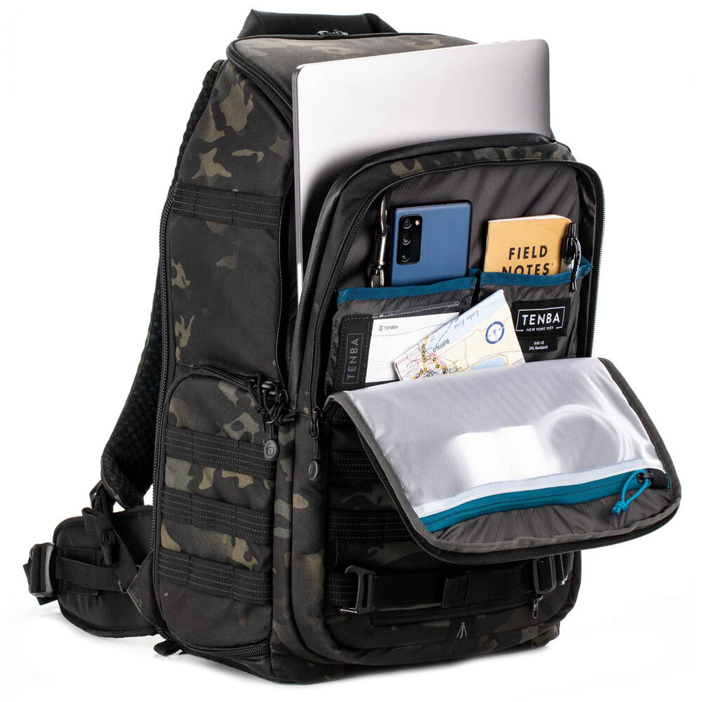 The updated multicam black, 24L Axis V2 Backpack from Tenba is built for the working professional, content creator, photographer, or filmmaker. The pack holds two mirrorless or DSLR cameras, eight 2.8mm lenses, a 16" laptop, and a compact drone. This backpack is the first to include a hidden neoprene pocket that holds an Apple AirTag or Tile Bluetooth Tracker. The MOLLE webbing all around the exterior of the pack allows you to add additional Tenba accessories, including lens capsules, battery pouches, and card wallets. Tenba's exclusive Airflow harness and auto-adjusting Pivot-Fit straps mean the pack will fit, no matter what shape or size you are. The bag has unique dual sternum straps to ensure superior load-balancing across the chest, and allowing female users to position the straps above or below the bust for superior comfort. One of the sternum straps can be removed, if desired. A reversible rain cover is included, one side is black and the other silver to reflect UV rays.