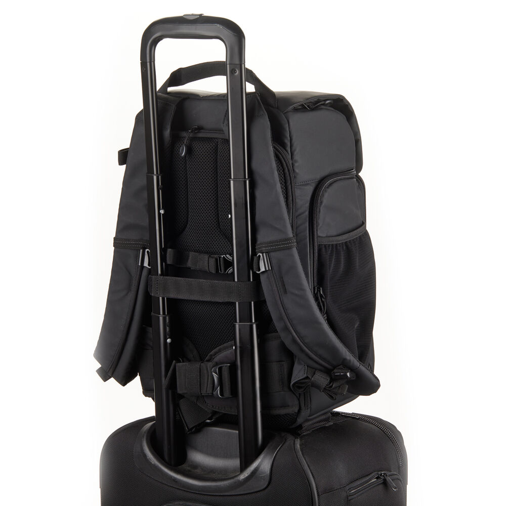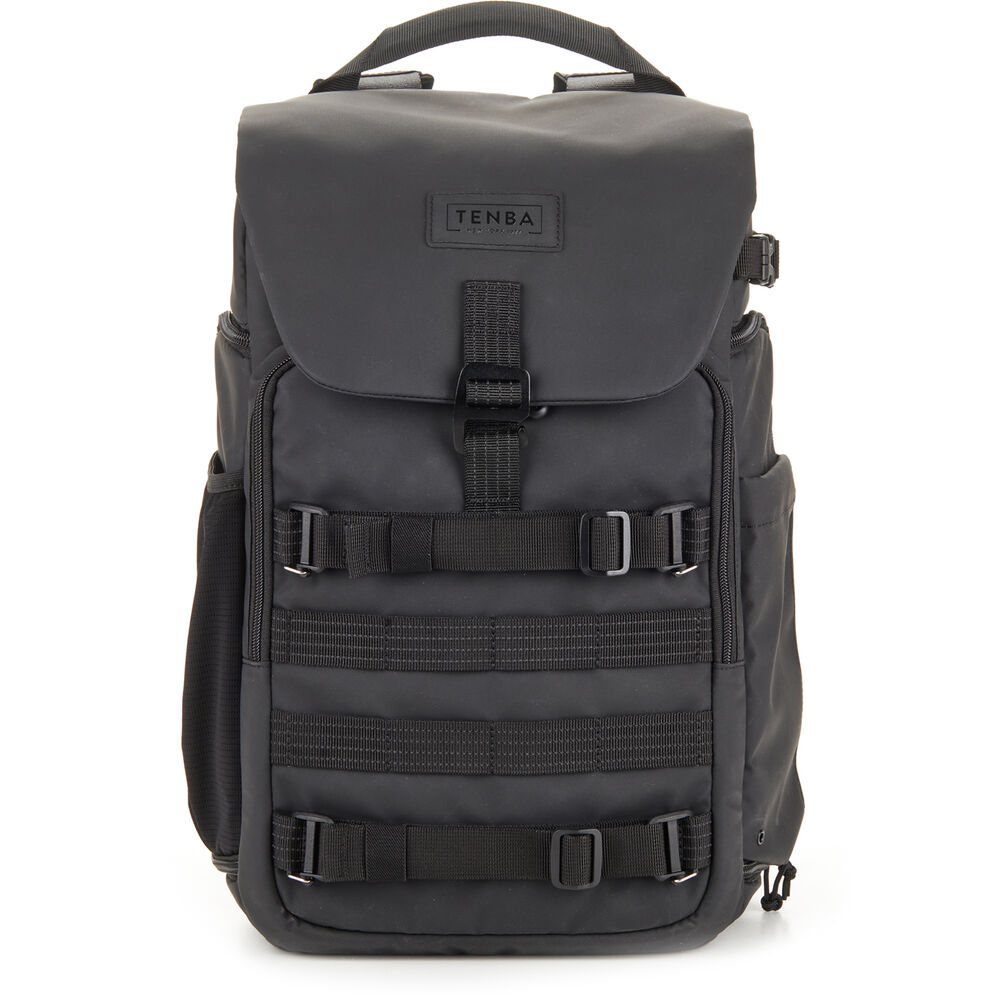 The black Axis V2 LT Backpack from Tenba has an 18L capacity and is an ideal choice for transporting your camera gear and personal items. This pack accommodates two mirrorless or DSLR cameras with four to six lenses and an attached lens up to 70-200mm f/2.8. You can also pack a 14" laptop in the designated sleeve. Under the top flap there's a convertible daypack section that you can use for more camera gear, a drone kit, food, or a rain jacket. The exterior MOLLE webbing allows for expandability with Tenba Tools Lens Capsules, Battery Pouches. and Memory Card Wallets, as well as a variety of military-standard pouches and accessories. Tenba's Airflow harness and auto-adjusting Pivot-Fit Straps allow the pack to comfortably fit users of various sizes. This backpack features dual side camera access and there is a hidden pocket designed to hold a personal tracker like an Apple AirTag or a Tile Bluetooth Tracker.