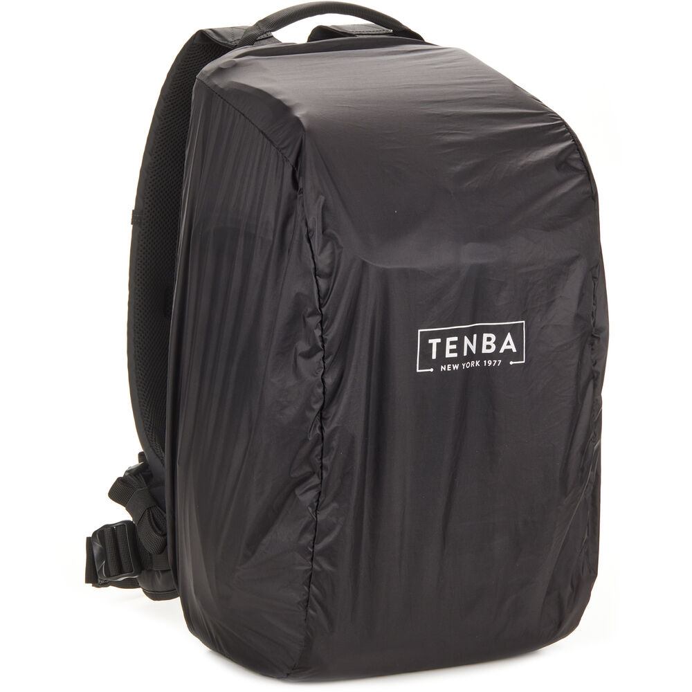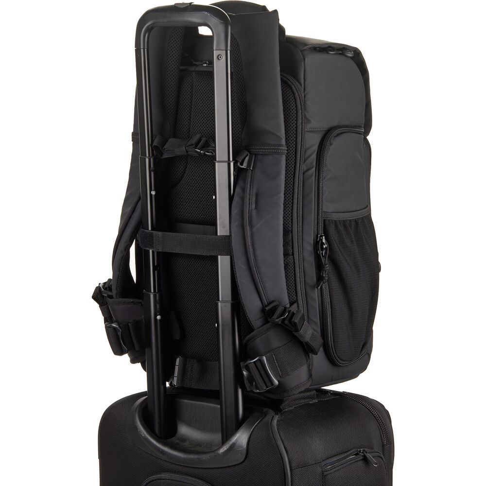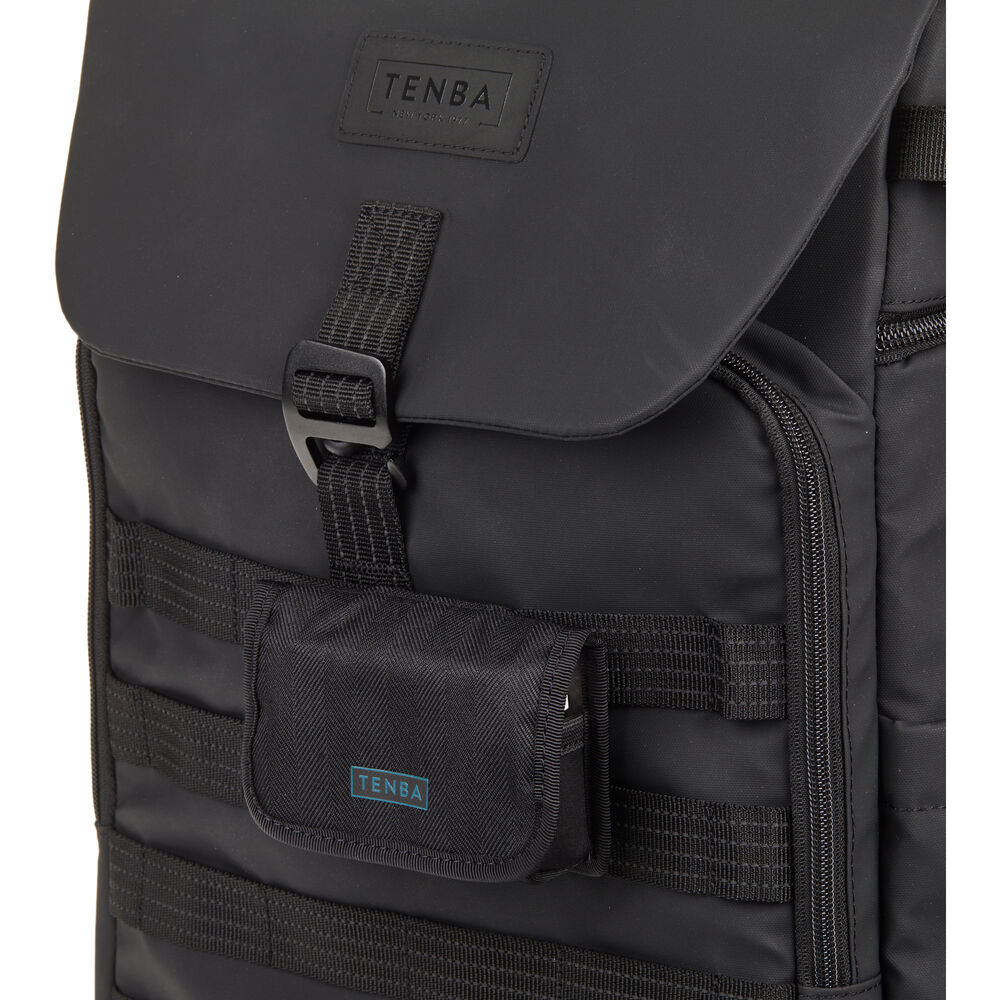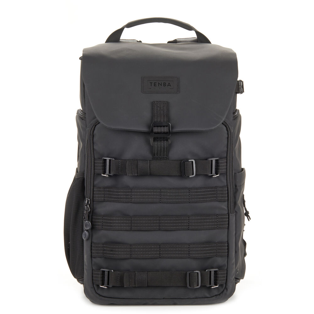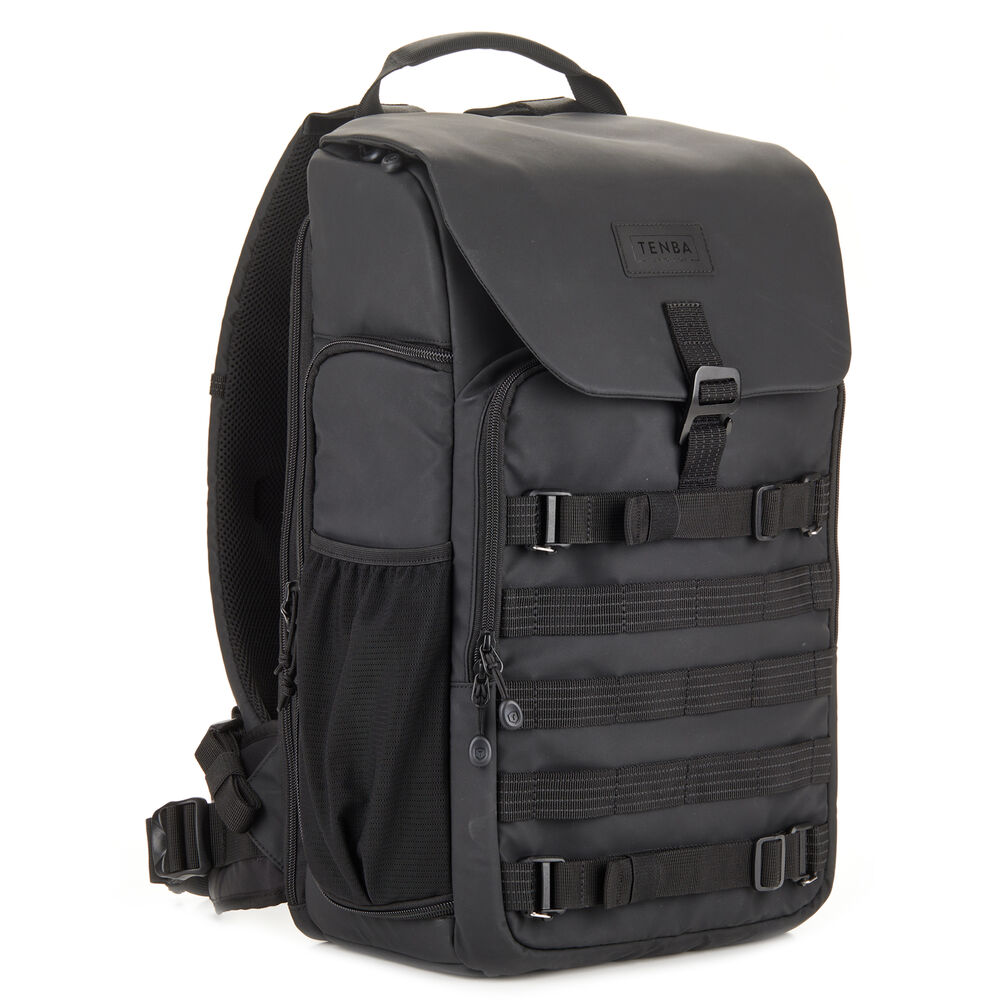 The black Axis V2 LT Backpack from Tenba has a 20L capacity and is an ideal choice for transporting your camera gear and personal items. This pack accommodates two mirrorless or DSLR cameras with four to six lenses and an attached lens up to 70-200mm f/2.8. You can also pack a 16" laptop in the designated sleeve. Under the top flap there's a convertible daypack section that you can use for more camera gear, a drone kit, food, or a rain jacket. The exterior MOLLE webbing allows for expandability with Tenba Tools Lens Capsules, Battery Pouches. and Memory Card Wallets, as well as a variety of military-standard pouches and accessories. Tenba's Airflow harness and auto-adjusting Pivot-Fit Straps allow the pack to comfortably fit users of various sizes. This backpack features dual side camera access and there is a hidden pocket designed to hold a personal tracker like an Apple AirTag or a Tile Bluetooth Tracker.