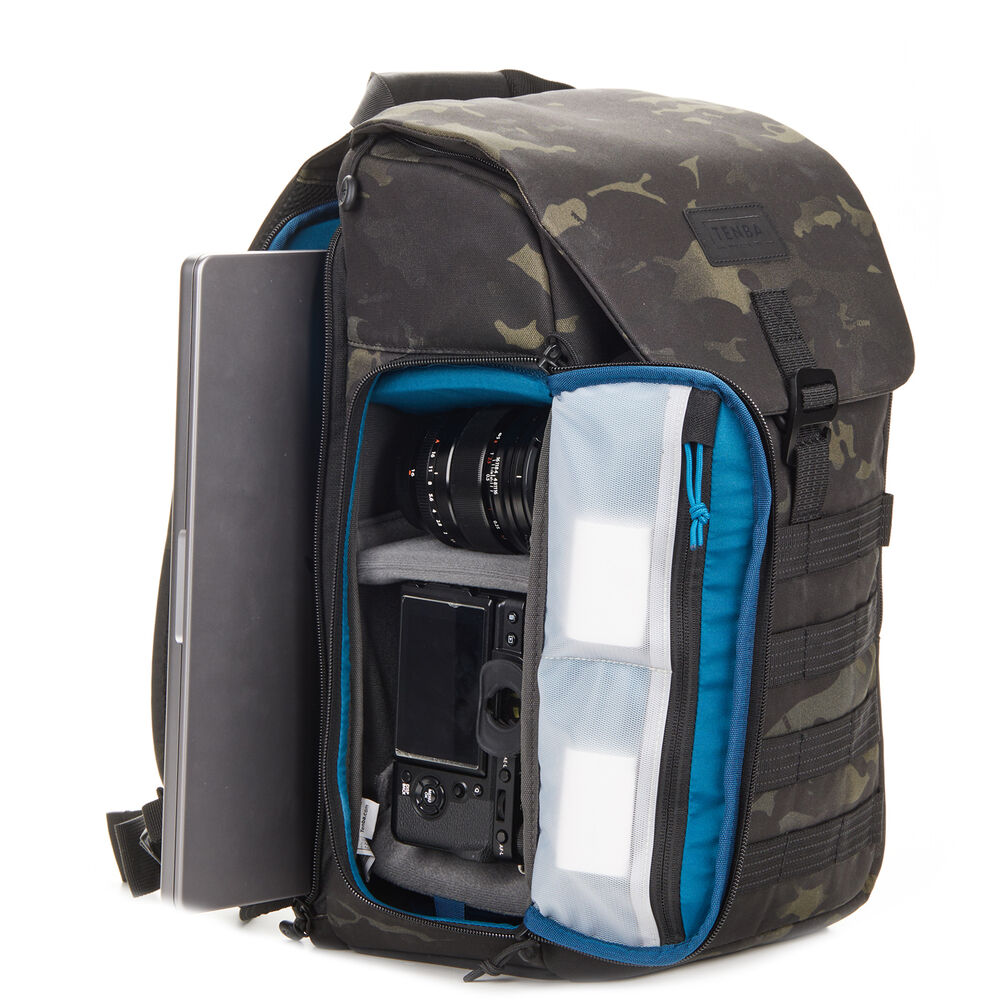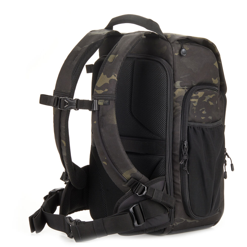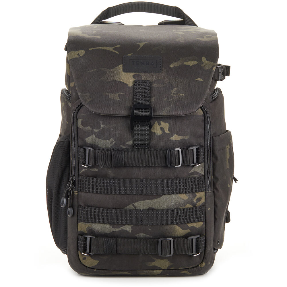 The MultiCam black Axis V2 LT Backpack from Tenba has an 18L capacity and is an ideal choice for transporting your camera gear and personal items. This pack accommodates two mirrorless or DSLR cameras with four to six lenses and an attached lens up to 70-200mm f/2.8. You can also pack a 14" laptop in the designated sleeve. Under the top flap there's a convertible daypack section that you can use for more camera gear, a drone kit, food, or a rain jacket. The exterior MOLLE webbing allows for expandability with Tenba Tools Lens Capsules, Battery Pouches. and Memory Card Wallets, as well as a variety of military-standard pouches and accessories. Tenba's Airflow harness and auto-adjusting Pivot-Fit Straps allow the pack to comfortably fit users of various sizes. This backpack features dual side camera access and there is a hidden pocket designed to hold a personal tracker like an Apple AirTag or a Tile Bluetooth Tracker.