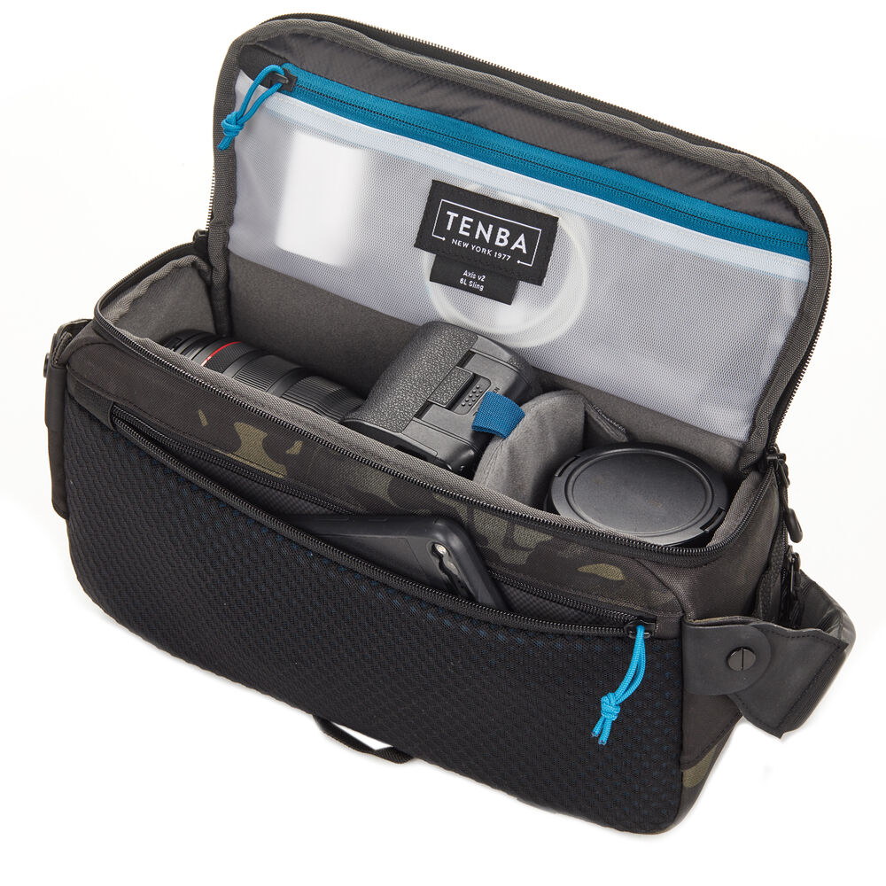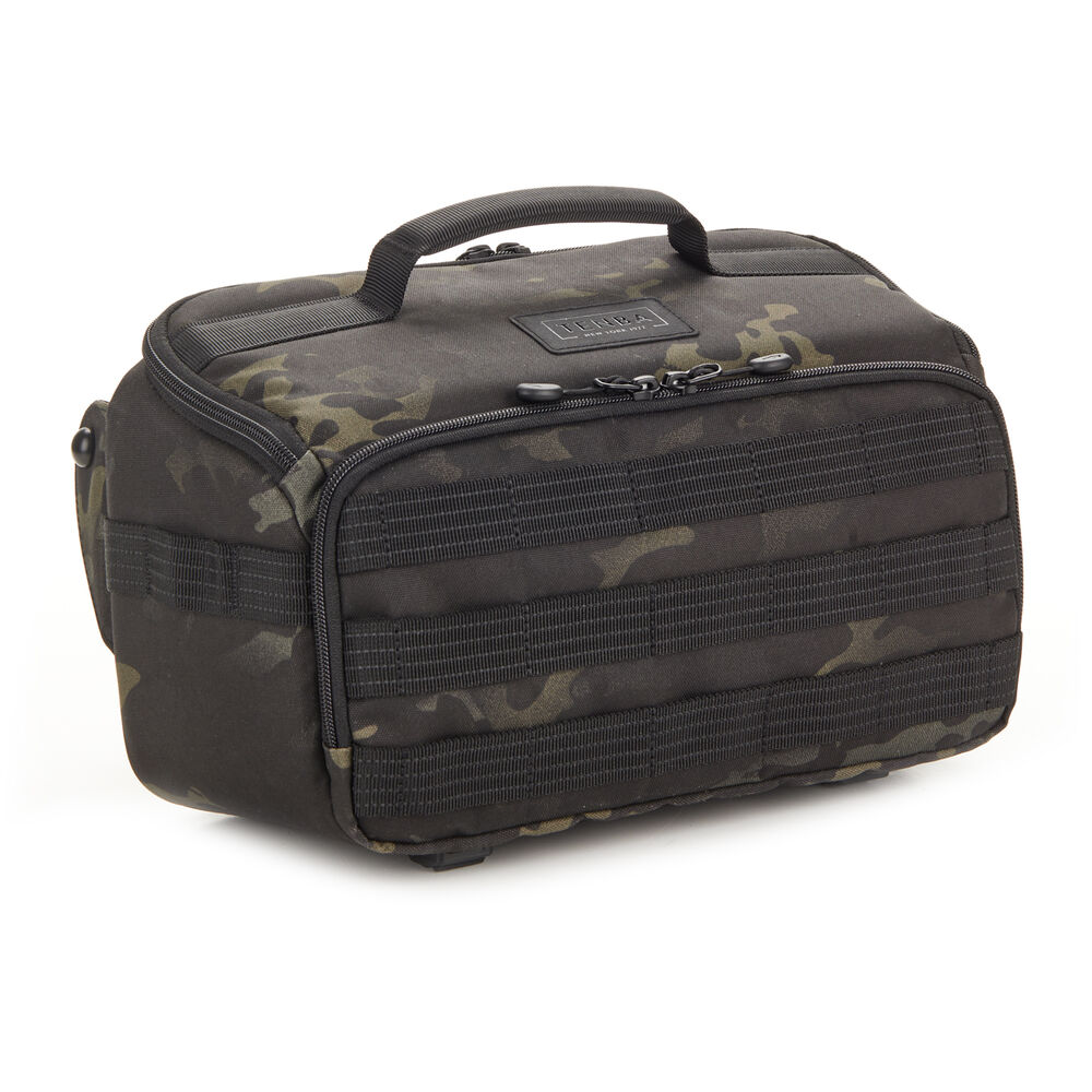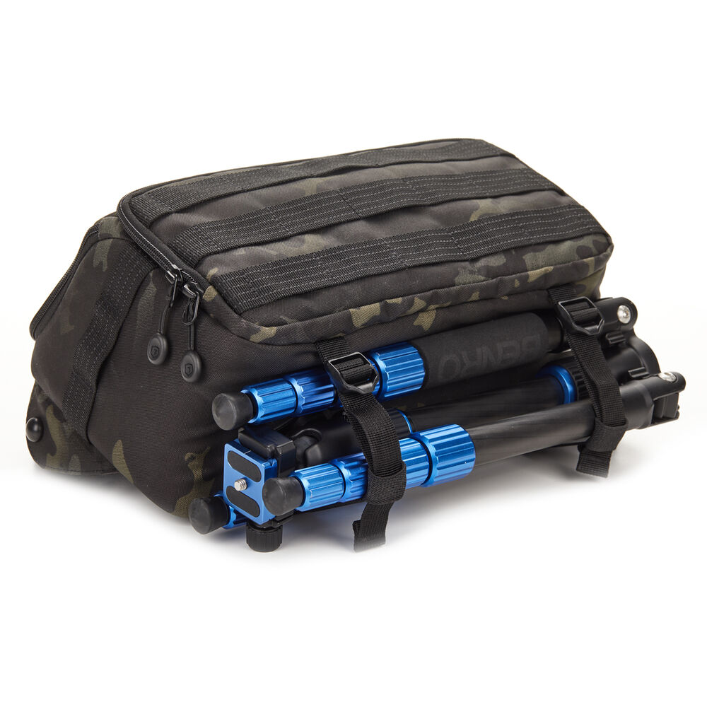 The MultiCam black AXIS V2 Sling Bag from Tenba has a 6L capacity to protect and transport a camera plus four lenses up to 70-200mm f/2.8 or a DJI Mavic drone kit.. Expandable MOLLE webbing on the exterior is compatible with Tenba Tools Battery Pouches and Memory card wallets. This webbing can also accommodate various military-standard pouches and accessories. The shoulder strap has soft, body-contouring memory foam to keep you comfortable even when you're carrying heavy loads for long periods. The bottom of the bag has straps for carrying a tripod or a monopod. A hidden pocket holds a user-supplied Apple AirTag or Tile Bluetooth Tracker so you can locate your sling if it gets lost.