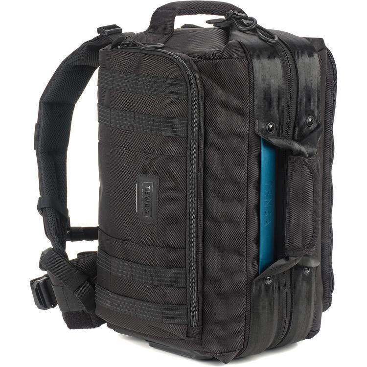 The Cineluxe V2 Backpack 16 in black from Tenba accommodates compact mirrorless, DSLR, or cinema cameras up to 15" long along with assembled accessories. It features a doctor bag-style opening down the middle for easy access to stored gear while maintaining the bag's footprint when opened. Upgrades to the V2 design include a hidden AirTag tracker pocket, MOLLE webbing on the exterior, lockable zippers, and a reversible silver/black cover to protect your gear from the sun and rain.