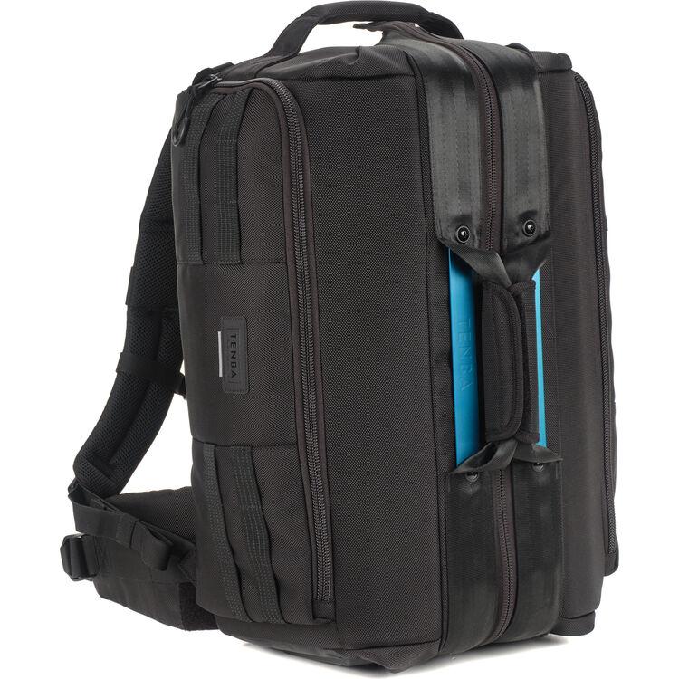 The 29L Cineluxe V2 Backpack 21 in black from Tenba accommodates compact mirrorless, DSLR, or cinema cameras up to 18.5" long, plus assembled accessories. It features a doctor bag-style opening down the middle for easy access to stored gear and maintaining the bag's footprint when opened. Upgrades to the V2 design include a hidden AirTag tracker pocket, MOLLE webbing on the exterior, lockable zippers, and a reversible rain cover to protect your gear from the elements.