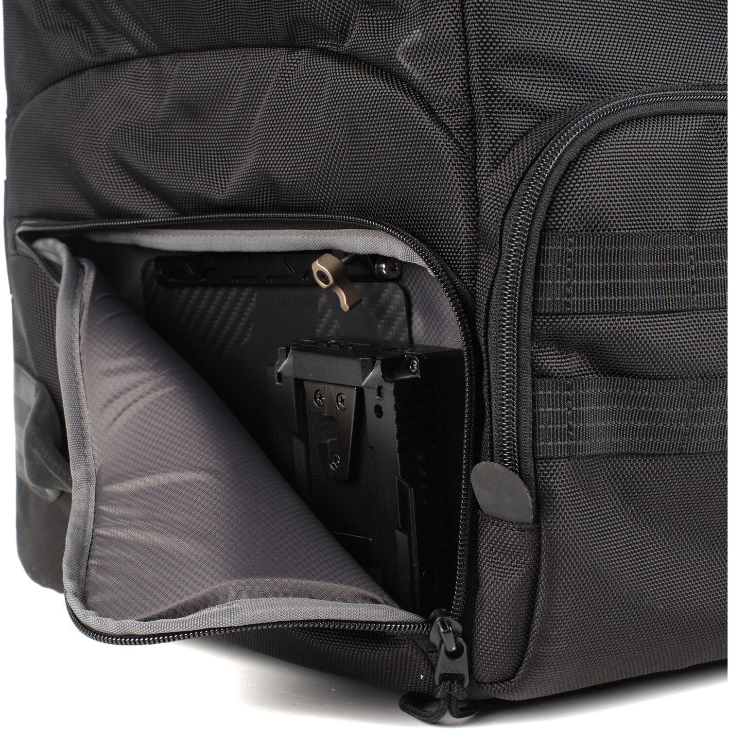 Upgrades to the V2 design include a new hidden AirTag tracker pocket, MOLLE webbing on the exterior, lockable zippers, and a reversible rain cover to protect your gear from the elements. Like other Cineluxe models, this bag has a built-in harness cover to protect the straps when laying on a wet or dirty surface. A zippered pouch, two soft-padded wraps, and two flex-core dividers help organize your stored accessories while protecting them from any jostling during travel.
