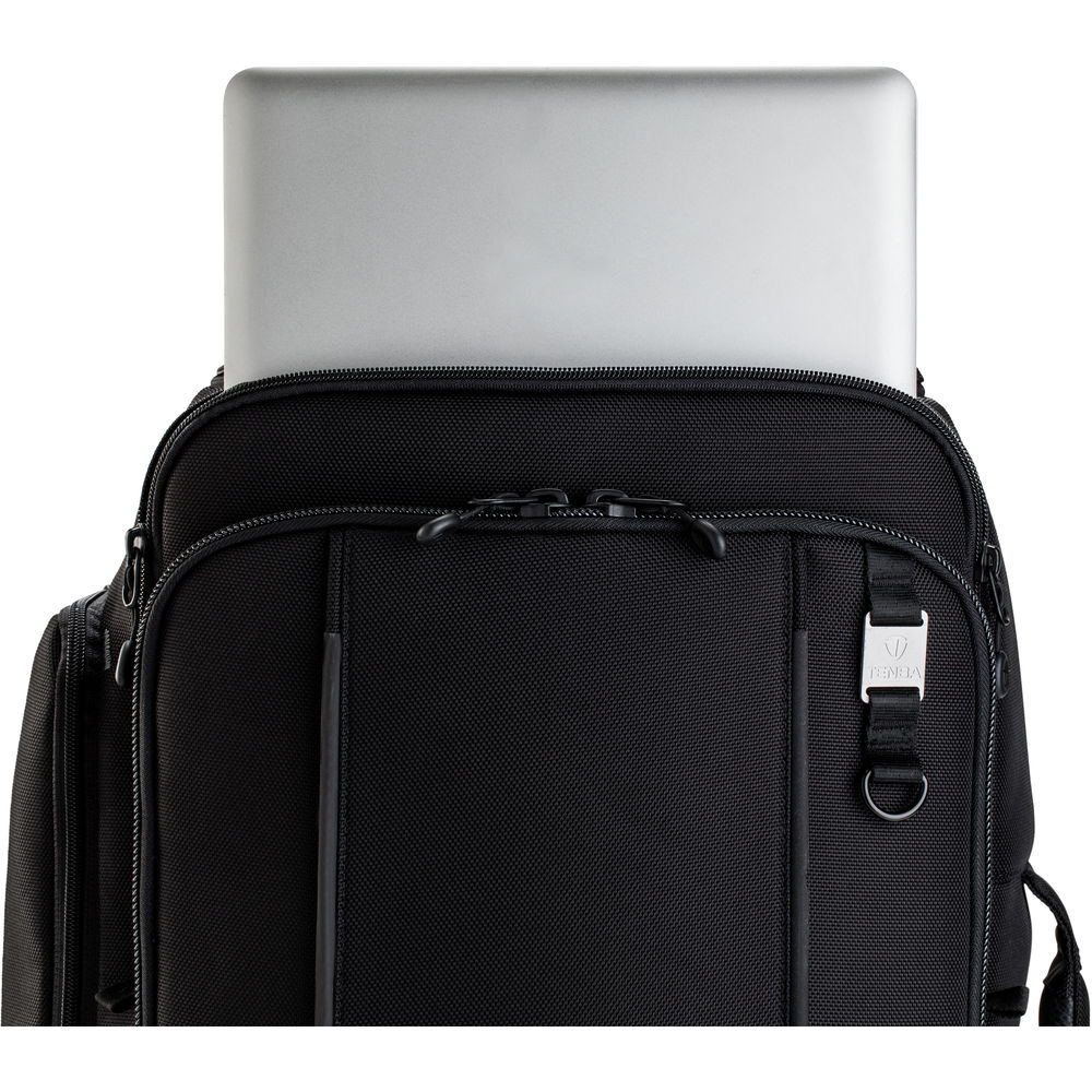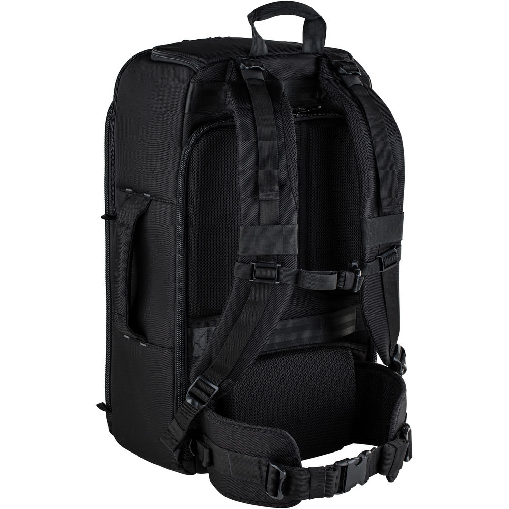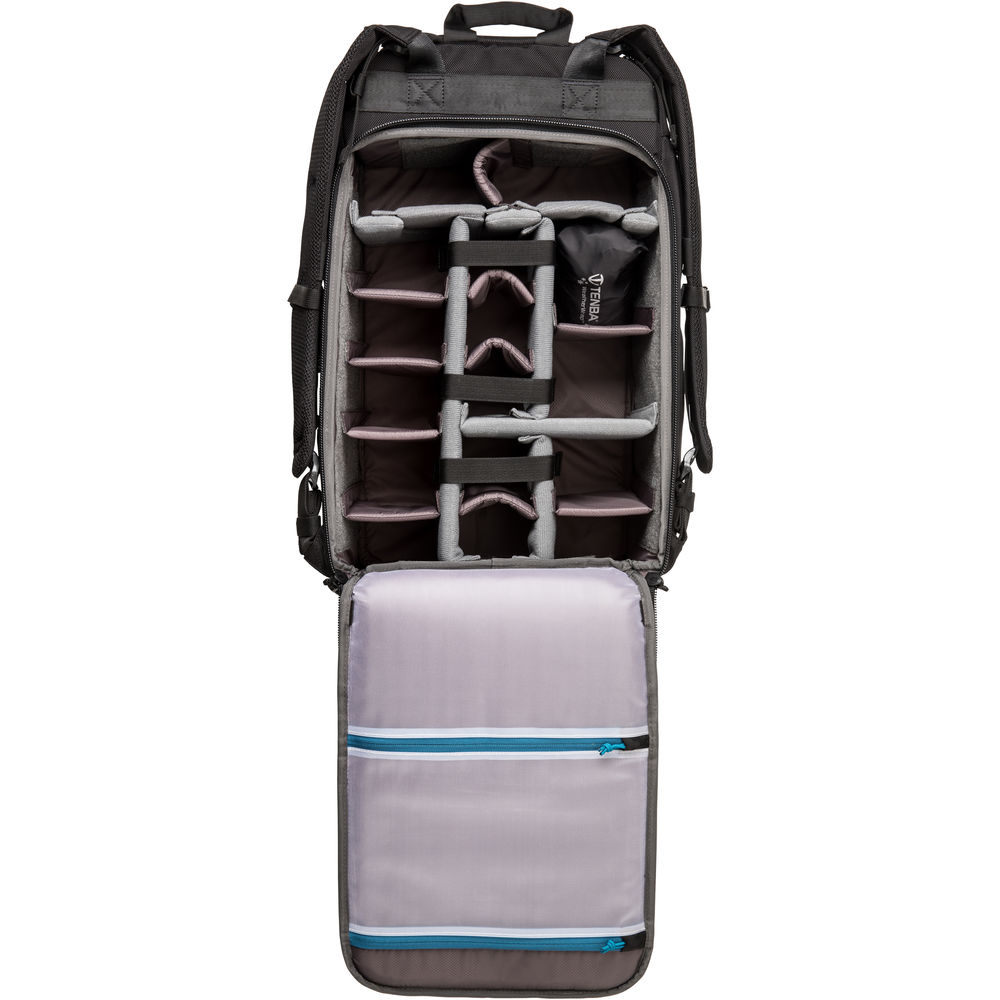 Comfortably carry two gripped DSLR or mirrorless cameras, up to eight lenses, and related accessories with the black Tenba Roadie 22 Backpack. The pack has rear access to camera gear, and front access to other items. There's also a separate compartment for a laptop up to 17". Inside the main compartment are padded touch-fastening dividers, and clear mesh accessory pockets. The exterior front zip compartment has a variety of pockets, and the side of the pack has a large pocket for accessories, or for securing a compact tripod.