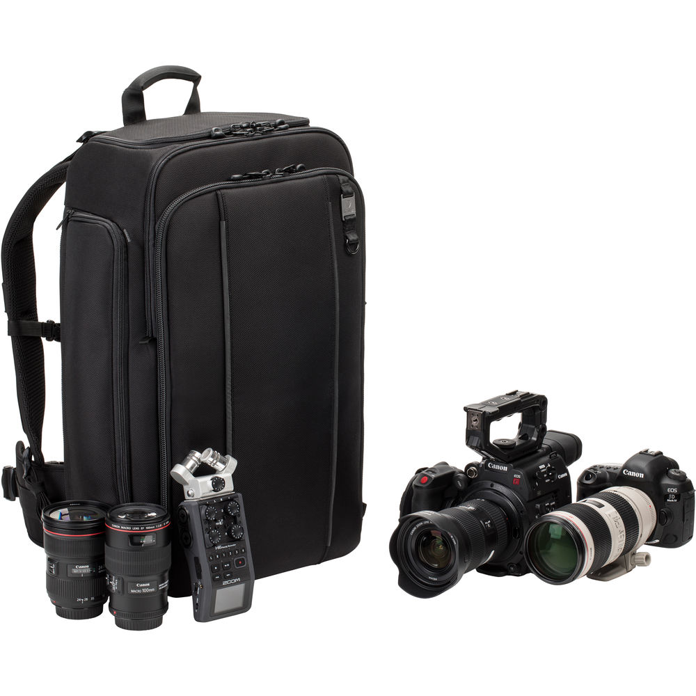 - Holds two Mirrorless or DSLR cameras (up to pro size with grip) with 6-8 lenses (up to 400mm f2.8), or a Canon, RED, or Sony cine camera with 3-5 lenses, plus audio gear (headphones, recorder), tripod, monopod or shotgun mic, and a laptop up to 17 inches. Will also hold a DJI Mavic and other compact drones.
