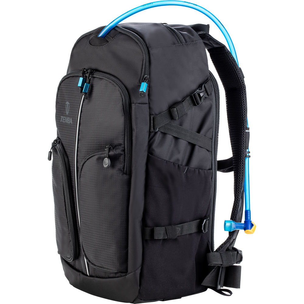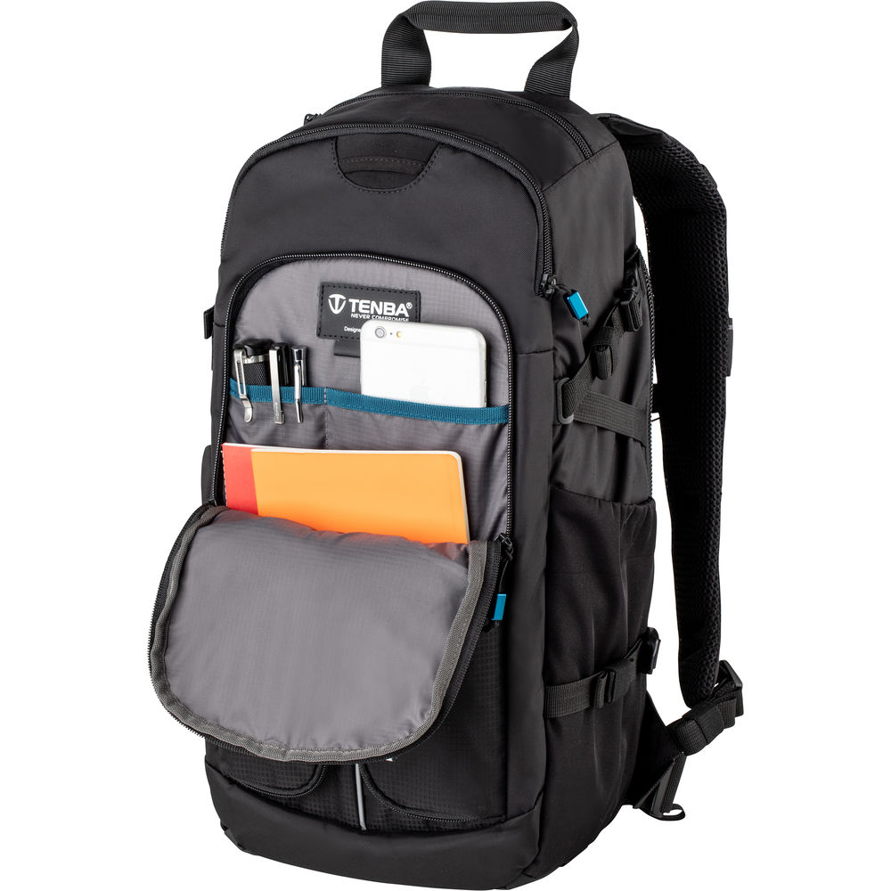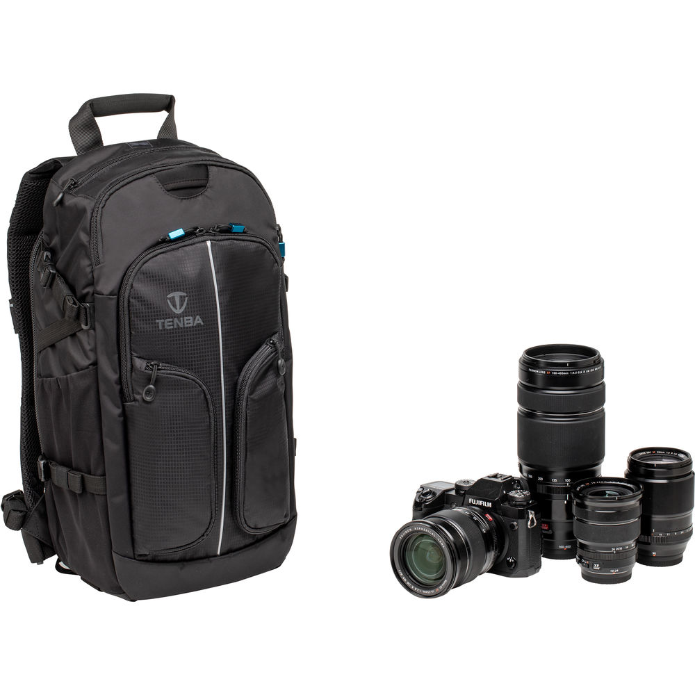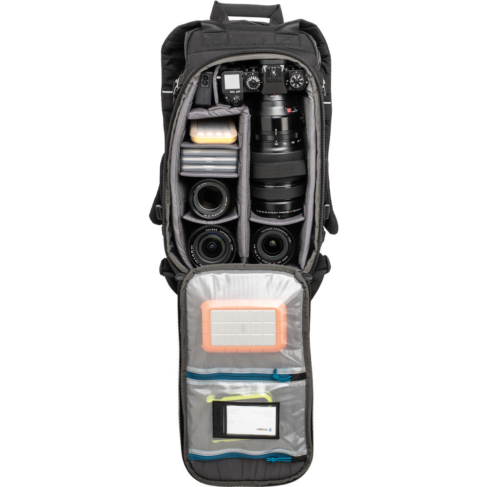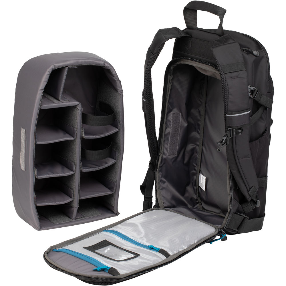 This black Shootout 14L Slim Backpack from Tenba is designed to accommodate the combined interests of the on-the-go photographer, multimedia creator, hiker, or adventure traveler. Inside the main compartment is a removable equipment insert with ten padded, adjustable dividers that can hold one to two mirrorless cameras or compact DSLRs along with three to five lenses, including a 70-200mm f/2.8 lens. In addition to a wide variety of camera equipment, the Shootout 14L Slim Backpack can accommodate a compact drone kit while the removable insert's two, touch-tab straps can be used to further ensure that critical or heavier gear remains firmly secured on the way to your next destination.