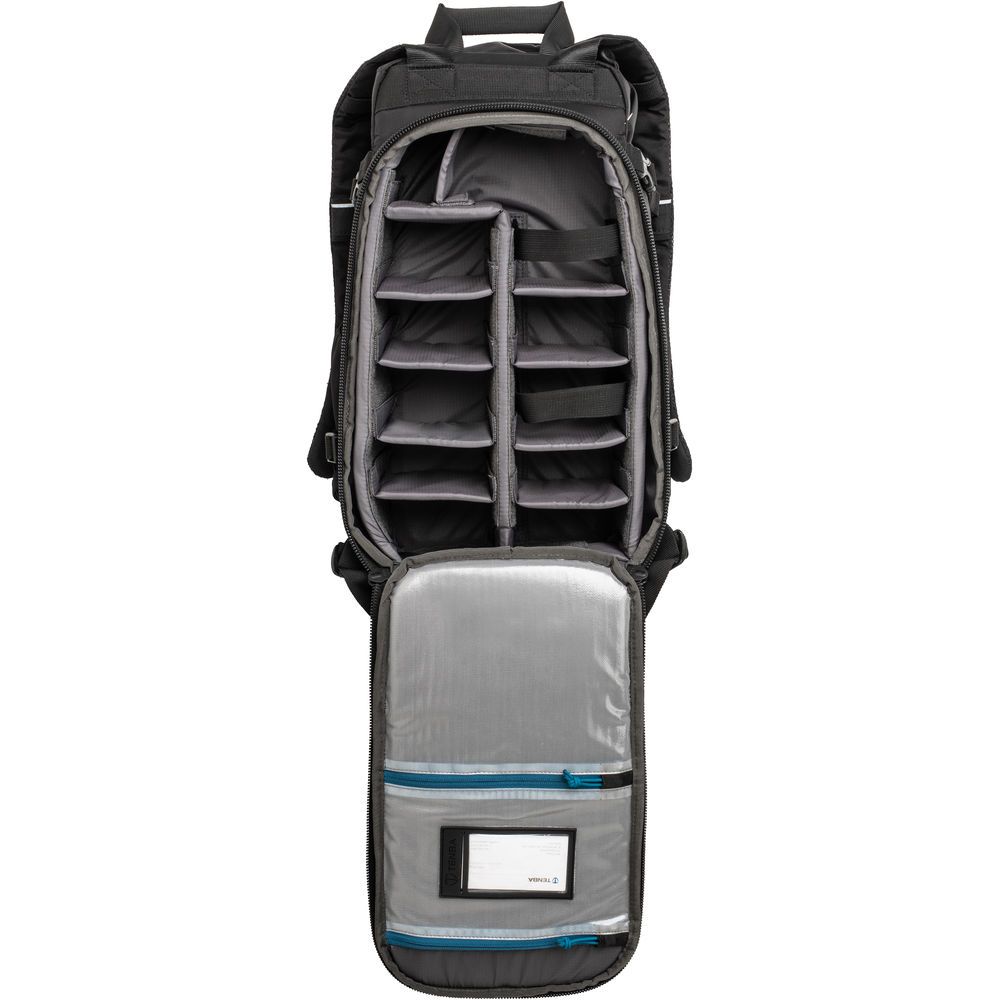 Complete access to the backpack's main compartment is provided by a rear-facing zippered panel with a 180° downward opening. By rotating the Shootout 14L Slim Backpack from one's back to front with the waist belt in use and the rear panel facing upward, the wearer can open this backpack without having to fully remove it. Along the inside of the rear panel is a see-through business card holder, plus two see-through zippered organizer pockets for hard drives, portable batteries, camera filters, or small electronics.