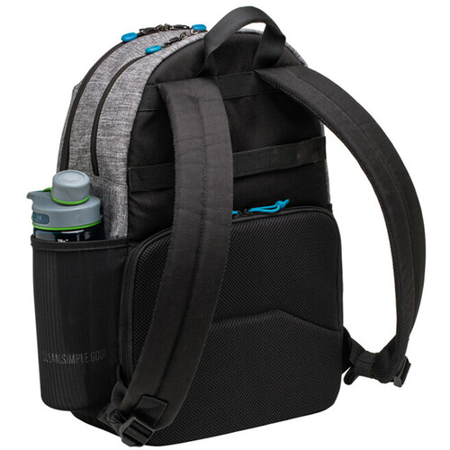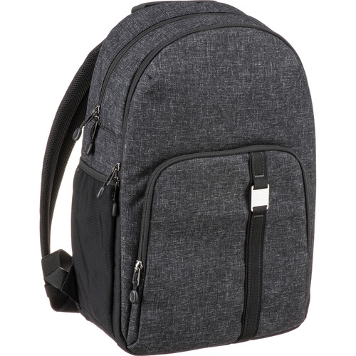 The Tenba Skyline 13 Backpack in black is made from water-repellent polyester and has durable reinforced stitching for long-term use. It holds a mirrorless or pro DSLR camera with an attached 70-200mm lens, two additional lenses, and a flash. The rear camera compartment closes securely via the YKK zipper. The top daypack storage compartment holds a jacket, a smartphone, plus other necessities, and the front pocket holds a 13" laptop. The bag is carried via the backpack straps or the top handle, and to get through the airport quickly you can conveniently slide the rear trolley strap over your luggage handle. A decorative laser-engraved aluminum badge on the front allows you to easily identify the bag from a distance.