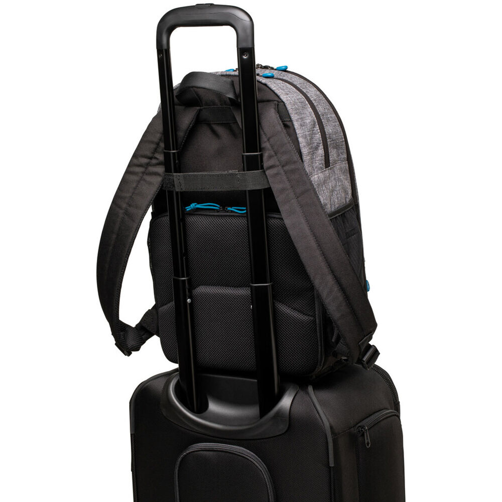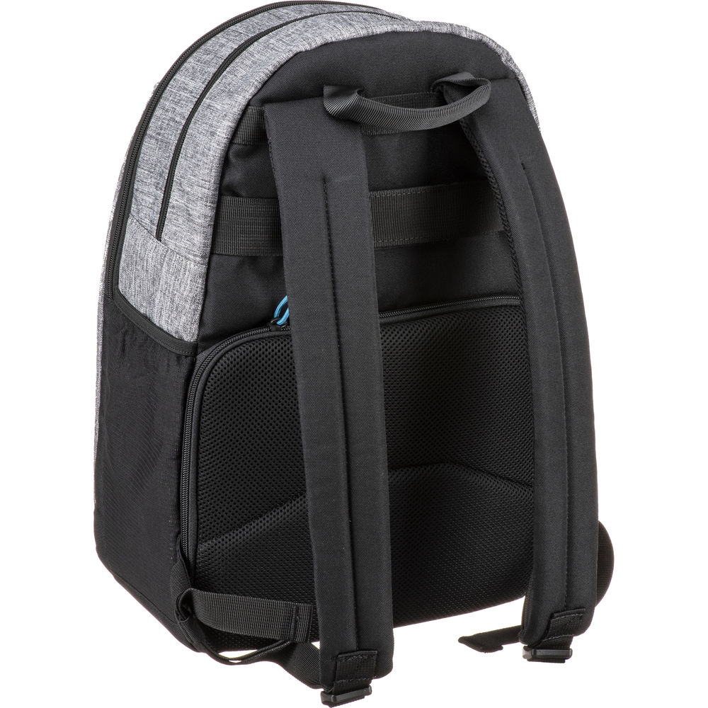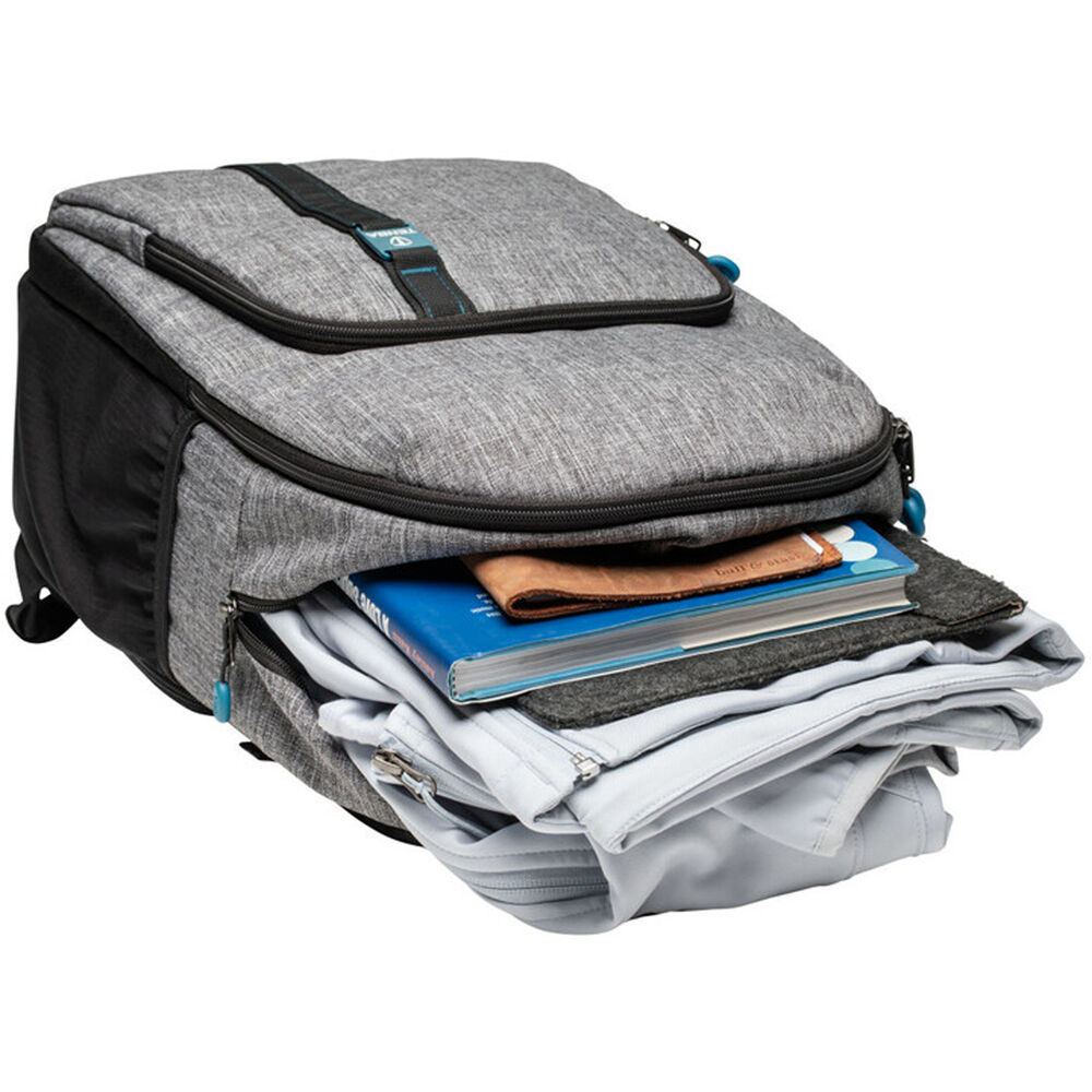 The Tenba Skyline 13 Backpack in gray is made from water-repellent polyester and has durable reinforced stitching for long-term use. It holds a mirrorless or pro DSLR camera with an attached 70-200mm lens, two additional lenses, and a flash. The rear camera compartment closes securely via the YKK zipper. The top daypack storage compartment holds a jacket, a smartphone, plus other necessities, and the front pocket holds a 13" laptop. The bag is carried via the backpack straps or the top handle, and to get through the airport quickly you can conveniently slide the rear trolley strap over your luggage handle. A decorative laser-engraved aluminum badge on the front allows you to easily identify the bag from a distance.