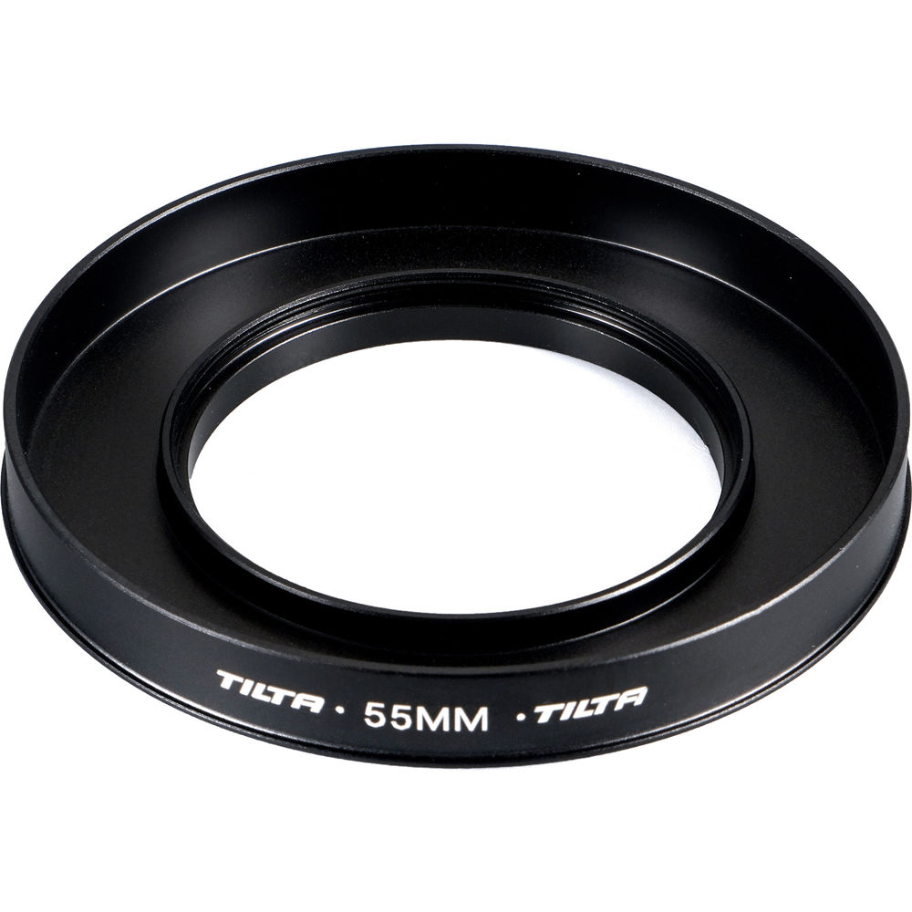 This Tilta 55mm Adapter Ring allows you to mount the Tilta Mini Clamp-On Matte Box on lenses that have a 55mm front diameter. The adapter ring screws onto the front of the lens, and the matte box then clamps onto the adapter ring. The thumbscrew on the side of the matte box is used to secure the matte box firmly to the adapter ring. The adapter ring also provides a thread for attaching 55mm screw-on filters to the lens. This is done right before mounting the matte box. After attaching the adapter ring to the lens, screw on the filter to the provided thread, and then attach the matte box. The adapter ring is made of aluminum and comes in black.