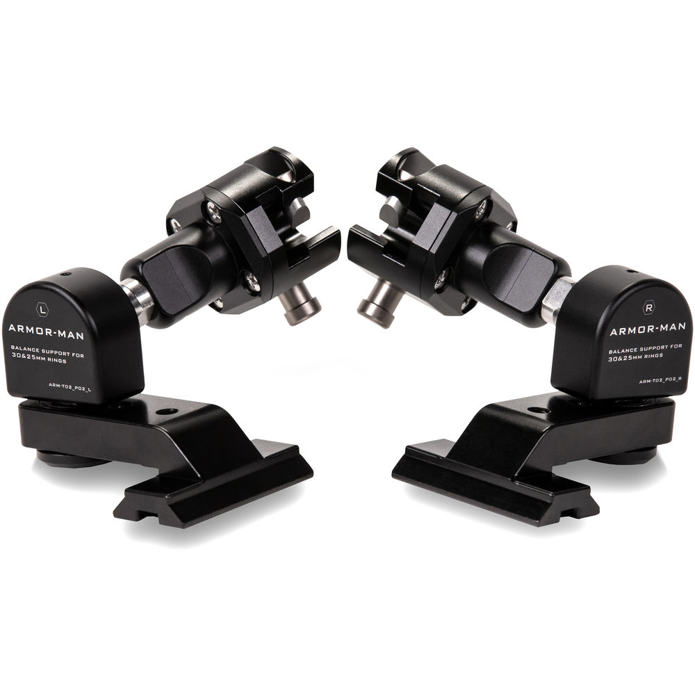 The Tilta Armor Man 3.0 Universal Gimbal Ring Adapters allow you to attach a ring-based gimbal to the Armor Man arms by quick release. They're for use in standard operating mode (as opposed to overhead mode). Two adapters are included. Also required for this workflow are the Armor Man 3.0 Universal Gimbal Ring Adapter Clamps, sold separately. The ring adapters are dovetail-based and easily and securely slide into the Armor Man arms. The ring adapter clamps attach to your gimbal ring. The adapters and adapter clamps then connect to one-another by quick release. To remove the gimbal, push the quick release buttons on the adapters, and the adapter clamps will come off.
