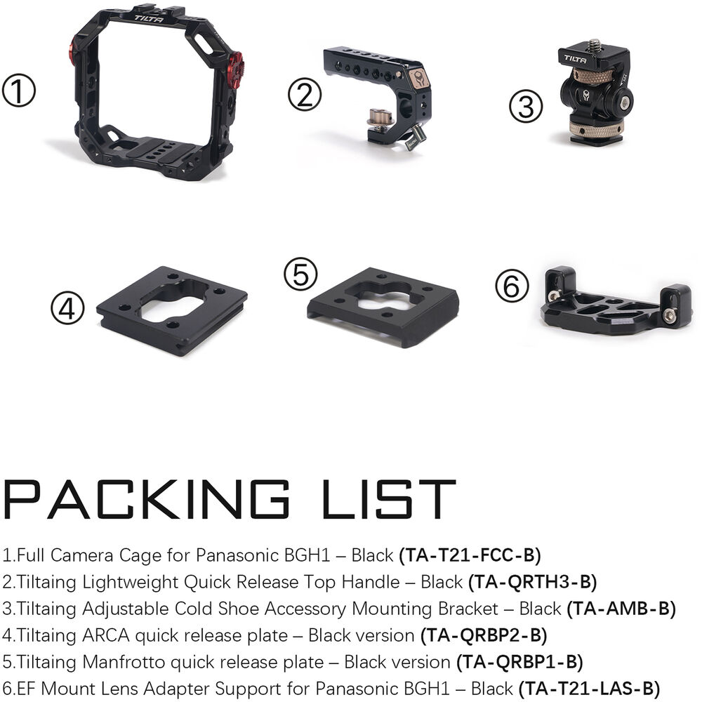 The Tilta Camera Cage Kit B for the Panasonic Lumix BGH1, in black, bundles the BGH1 cage with a top handle and a tension-adjustable monitor mount. The cage comes with a quick release plate for direct attachment to the optional Tilta 15mm LWS Baseplate for RED KOMODO Cage. Additionally, the kit includes Arca and Manfrotto quick release plates that attach to the bottom of the cage. A lens adapter support that attaches to the front of the cage to support optional EF mount adapters is also included.