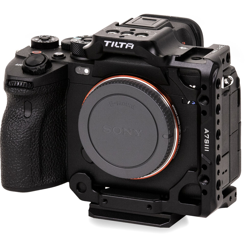 In a three-sided design that leaves the camera handgrip fully accessible, the Tilta Half Camera Cage for Sony a7S III, in black, provides one shoe mount and several 1/4"-20 accessory threads, allowing you to attach mics, lights, articulating arms, and other devices and accessories. On the bottom of the cage, there are multiple 1/4"-20 threads that allow you to find the optimal balance for your camera when mounting on tripods, gimbals, and other supports.