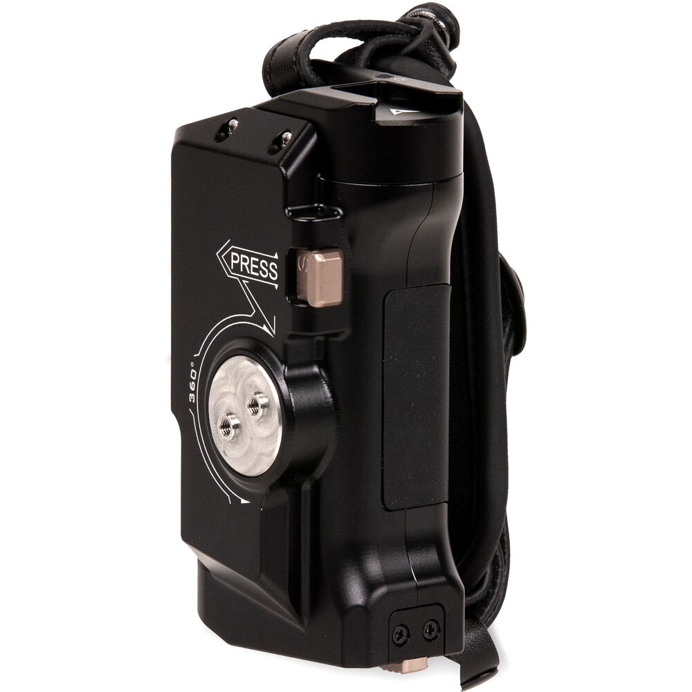 The Tilta Left-Side Advanced Power Handle, in black, attaches to the left side of Tiltaing camera cages using your choice of an optional rail/rosette mounting bracket—Tilta Left-Side Adapter Type IV, V, or VI. The handle accepts a Sony F570 battery (sold separately) and features two power outputs for running accessories off the battery. It offers an 8V USB Type-C output port and 12 VDC port. In addition to this, the Advanced Power Handle provides a run/stop button for controlling record start/stop on compatible cameras over an optional R/S cable connection.