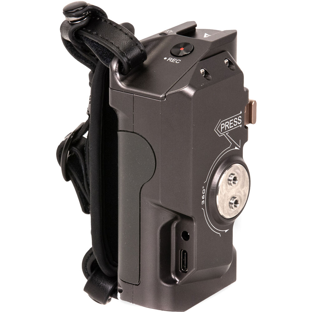 The Tilta Left-Side Advanced Power Handle, in Tilta gray, attaches to the left side of Tiltaing camera cages using your choice of an optional rail/rosette mounting bracket—Tilta Left-Side Adapter Type IV, V, or VI. The handle accepts a Sony F570 battery (sold separately) and features two power outputs for running accessories off the battery. It offers an 8V USB Type-C output port and 12 VDC port. In addition to this, the Advanced Power Handle provides a run/stop button for controlling record start/stop on compatible cameras over an optional R/S cable connection.