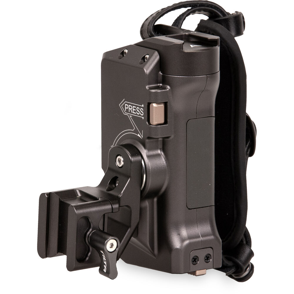 The handle attaches to the side of your Tiltaing cage using the included mounting arm, which features a NATO rail clamp. The handle accepts a Sony F570 battery, sold separately. There are two connections on the handle for powering accessories: an 8V regulated USB Type-C output and a 12 VDC output.