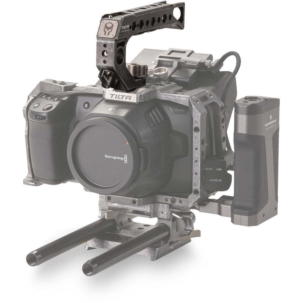 Carry and stabilize your Blackmagic Design Pocket Cinema Camera 4K with this lightweight tactical gray Quick Release Top Handle from Tilta. The quick release handle's features include two shoe mounts, a 15mm rod port, multiple 1/4"-20 and 3/8"-16 threads, and a 3/8"-16 thread with locating pins.