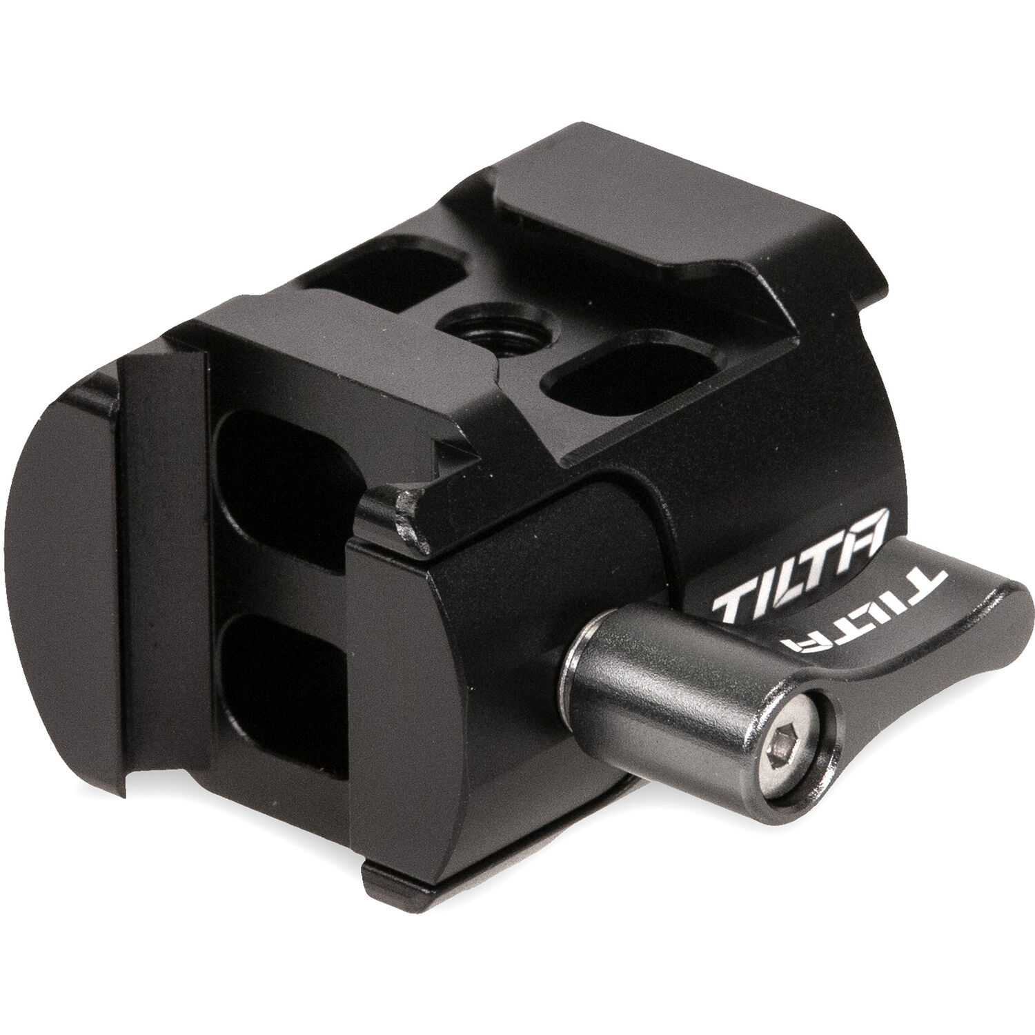 Add shoe-mounted accessories to your DJI RS 2, RS 3, RS 3 PRO, or RSC 2 gimbal with this Side-Mounted Shoe Mount from Tilta. The aluminum and stainless steel adapter mounts onto a NATO rail on the side of the DJI gimbal using a NATO clamp, and it is secured using a locking lever. The adapter features three shoe mounts around the sides, allowing you to add an extension arm, monitor, microphone, or other accessory to the gimbal handle.