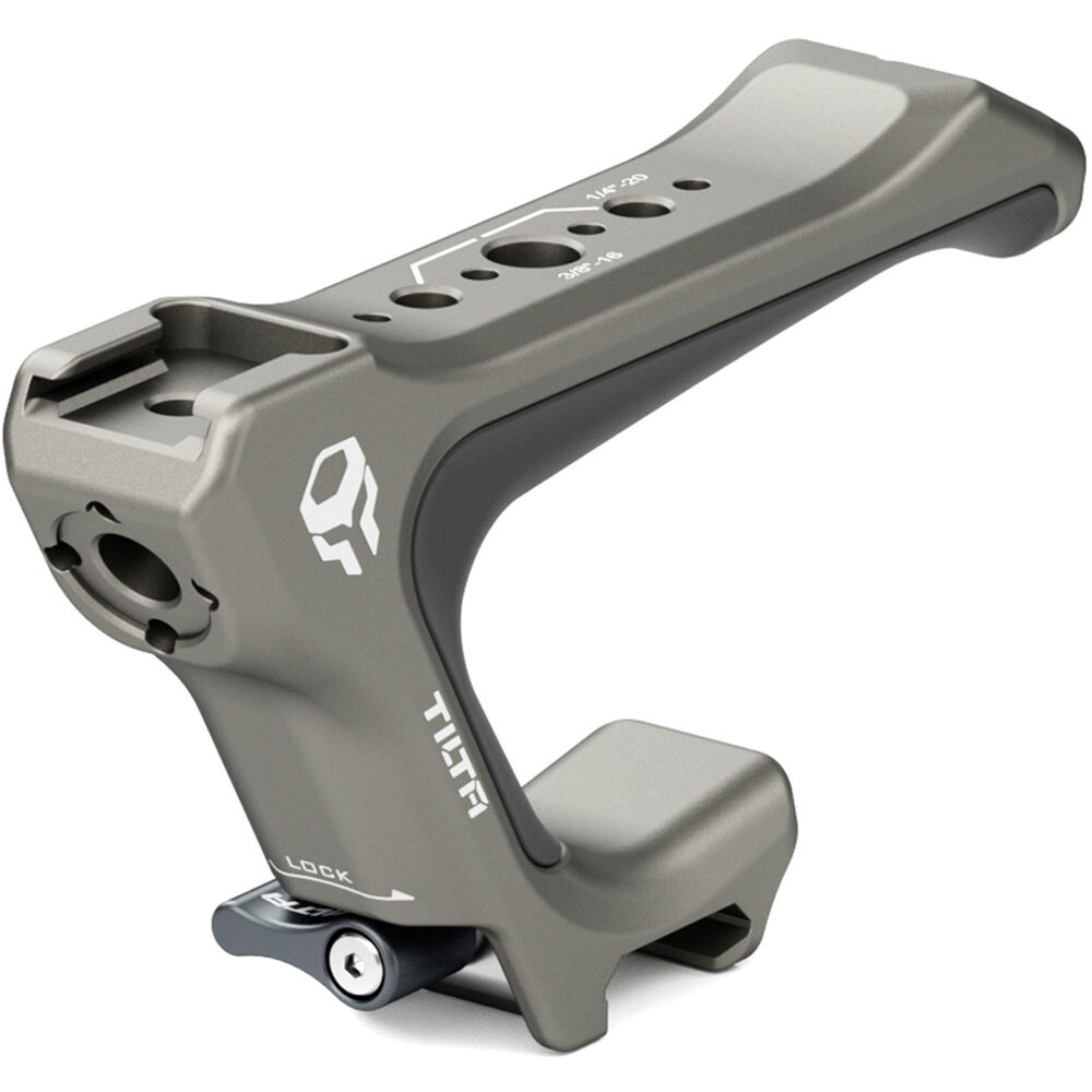 Carry and stabilize your Tiltaing camera cage with the titanium gray Tiltaing Compact NATO Top Handle from Tilta. This compact quick release top handle is smaller than the standard Tiltaing quick release handle and well suited for use with smaller cameras or when a smaller shooting package is desired. There is one shoe mount on top and multiple 1/4"-20 and 3/8"-16 threads, each featuring anti-twist divots.