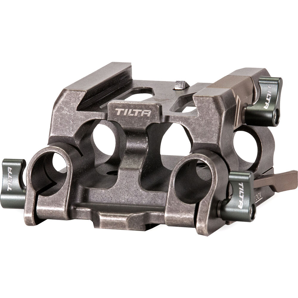 The tactical gray 15mm LWS Baseplate Type IV is compatible with Tilta full cages for RED KOMODO, Sony FX3, and Panasonic BGH1 cameras. Use this baseplate to add 15mm LWS rod support for accessories like a follow focus, matte box, or lens motor. The 15mm LWS Baseplate Type IV's dovetail bottom slides onto a separately available Tilta-standard baseplate or ARRI-style baseplate when used with the separately available Tilta to ARRI adapter. The bottom of the baseplate also incorporates several 1/4"-20 and 3/8"-16 threads for mounting a quick release plate.