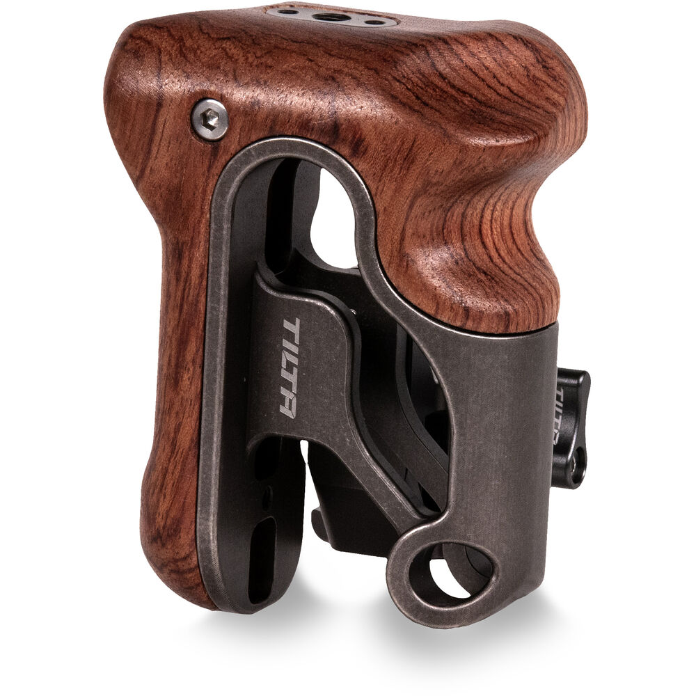 Style and comfort are the hallmarks of this Tiltaing Right-Side Wooden Handle Type VI from Tilta, in a tactical gray aluminum finish. The grip is hand-carved from black walnut wood for an attractive, comfortable, and temperature-stable handgrip that is mounted on an aluminum alloy frame, providing support and strength for mounting accessories. It features a removable NATO rail clamp for attaching to cages, and optional brackets allow you an even wider choice of mounting options. The top of the handgrip features a 1/4"-20 threaded mounting hole in the aluminum frame, allowing you to attach a variety of accessories to your grip.