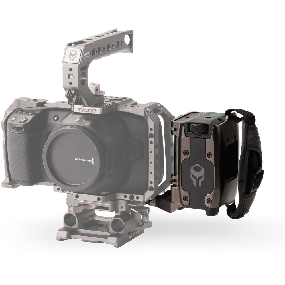 This cage component also features a knurled focus wheel, an 8V micro-USB output, a 12V output, and a rubberized surface for a secure grip. For run/stop control for the BMPCC 4K/6K, use the Tilta Advanced Focus Handle Type VI.