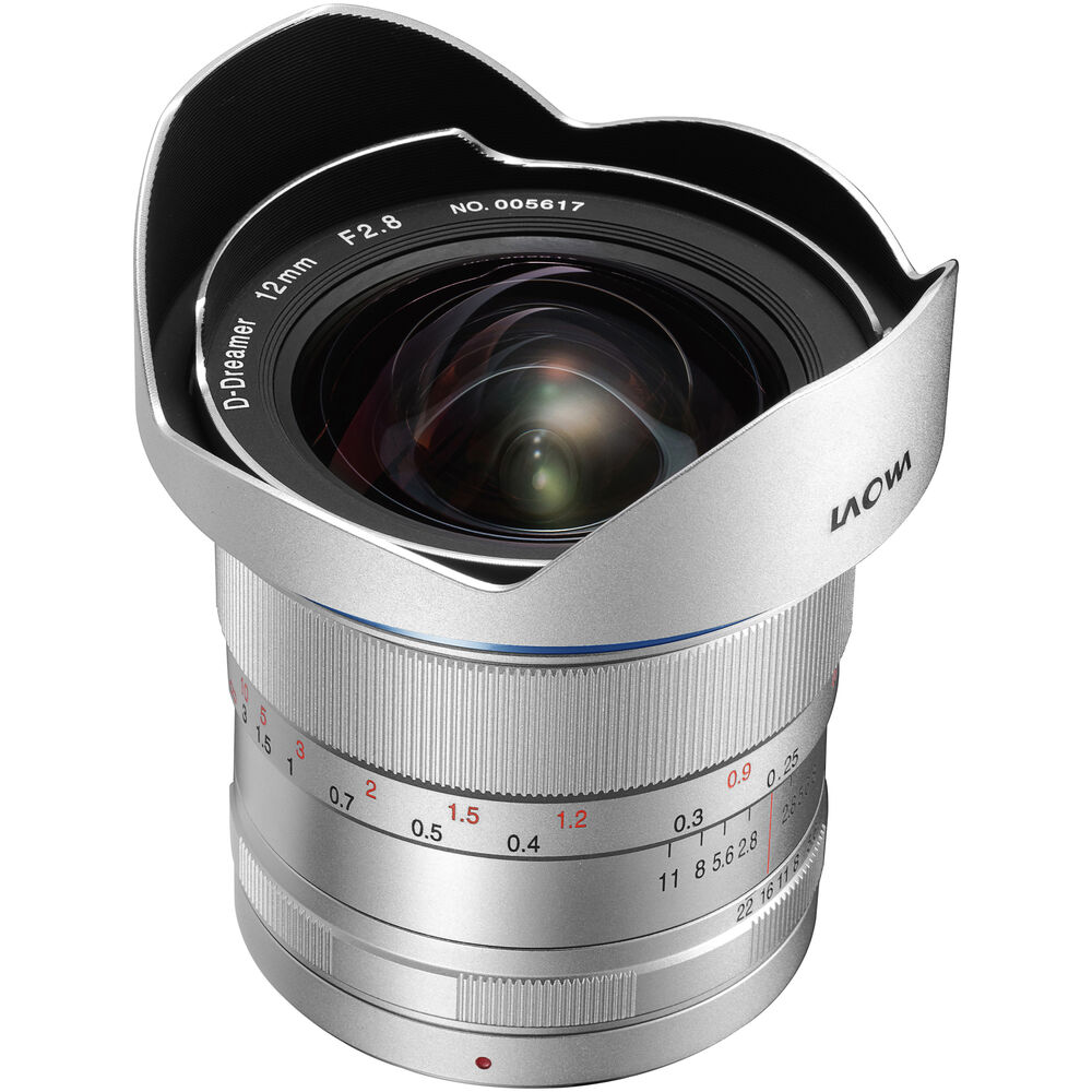A truly wide-angle prime featuring a rectilinear optical design, the silver Canon EF-mount Laowa 12mm f/2.8 Zero-D from Venus Optics is specifically meant to limit distortion for clear and accurate portrayals of landscapes and architectural subjects. The optical construction also incorporates a pair of aspherical elements and three extra-low dispersion elements to control both spherical and chromatic aberrations for improved sharpness and reduced color fringing. A Frog Eye Coating has been applied, too, to repel dust and moisture from the front element of the lens to benefit working in trying environmental conditions. Benefitting the optical attributes, this lens also features a precise manual focus design along with a floating optical system to maintain accurate rendering throughout the focus range, from 7.09" to infinity. Additionally, a petal-shaped lens hood is also incorporated into the lens' design to reduce flare and ghosting when working in strong lighting conditions.