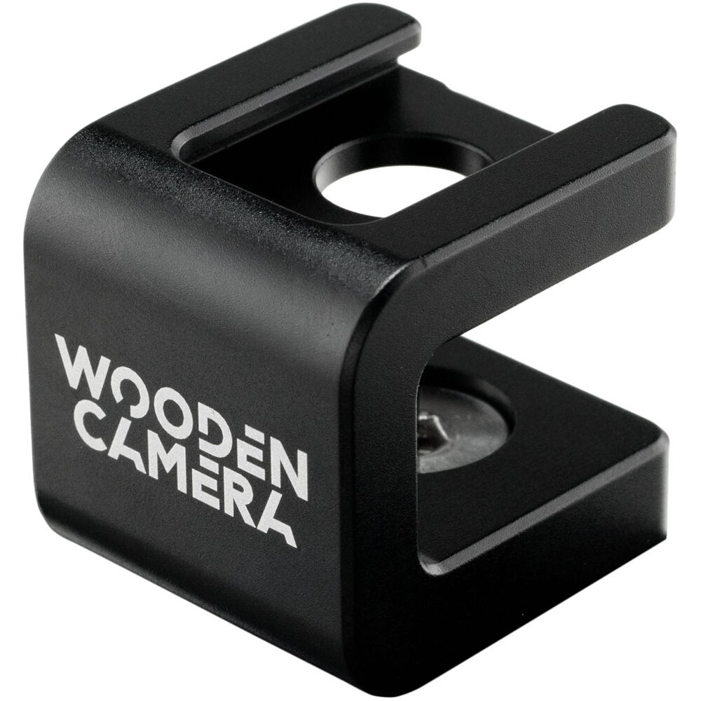 This Wooden Camera Cold Shoe Riser Bracket attaches to any 3/8"-16 mounting point and features removable locating pins for added security. It provides a standard cold shoe mount raised 23mm vertically from the center of the 3/8"-16 screw. Great for mounting on-camera lights, microphone shock mounts, and other accessories.